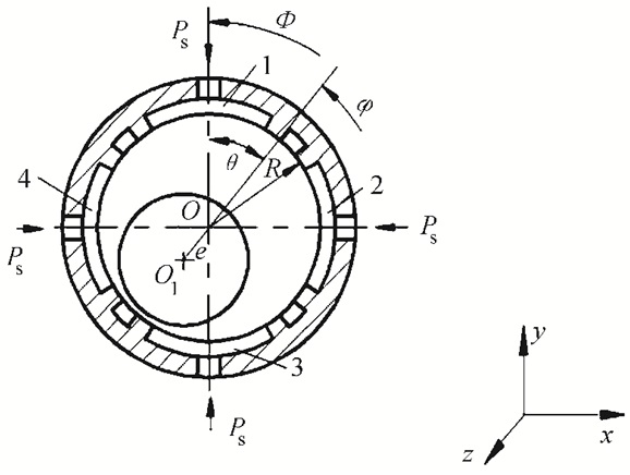 1 液体静压轴承-转子系统动力学模型 1.1 几何模型液体静压轴承的结构如图 1所示,在一定的外载荷的作用下,转子轴心和轴承中心不再重合,而是产生了一定的偏差,转子在外载荷的作用下最终的平衡位置为O1,两中心产生的位置偏差为e,角度偏差为θ,描述位置的角度为φ,设润滑油以恒定的油压Ps流入1、2、3、4腔。图 1坐中,x、y、z分别为轴承油膜的周向、径向、轴向坐标。