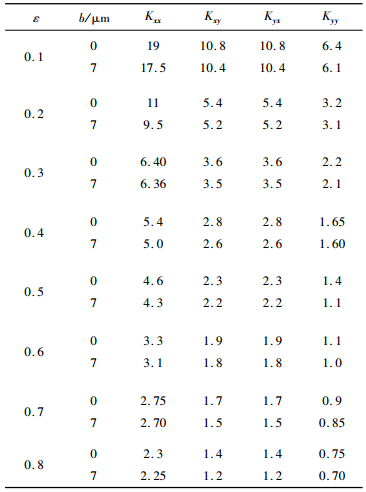 4 油膜动态特性数值仿真 4.1 油膜动刚度仿真表 1为油膜4个动刚度系数在发生滑移和无滑移的情况下随偏心率的变化关系,b为滑移长度,Kxx、Kxy、Kyx和Kyy为油膜的4个无量纲刚度系数。