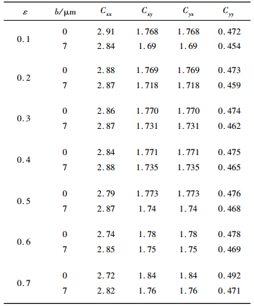 表 2为在滑移长度为0和7 μm时,4个油膜阻尼系数和转子偏心率之间的变化关系。b为滑移长度,Cxx、Cxy、Cyx和Cyy为从油膜的4个无量纲刚度系数。从表 2中可以看出,轴承内固-液界面速度滑移并没有对4个阻尼系数与转子偏心率之间的变化关系产生显著的影响,速度滑移效应对阻尼系数Cyx、Cxy和Cyy的影响规律比较明显和单一;受速度滑移的影响,在不同的偏心率下,油膜的阻尼系数都有降低,速度滑移程度越大,油膜阻尼的减小程度越明显。阻尼系数Cxx受速度滑移影响比较复杂,在不同的偏心率下,表现为不同的影响规律。