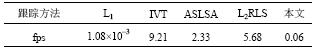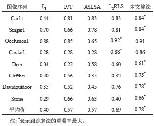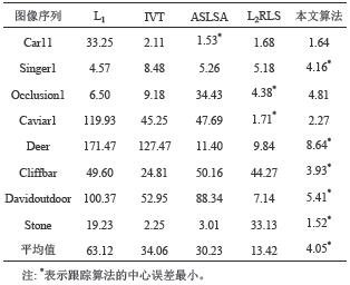 一个鲁棒的跟踪算法在保证准确性的前提下,也应满足跟踪的实时性。本文采用8组图像序列的平均帧率来评价跟踪算法的实时性,帧率指的是计算机每秒处理的帧数(frames per second,fps)。表3给出了在相同软硬件条件下,粒子数n=600、特征向量维度d=32×32时5种跟踪算法的平均帧率。由于L1算法采用内点法求解单个粒子的表示系数,使得计算复杂耗时较长,因而平均帧率最小;IVT算法的计算复杂度只涉及矩阵矢量相乘运算,处理过程比较简单,平均帧率最高;本文算法采用IALM方法和多候选粒子批处理的方法降低复杂度,因而平均帧率高于L1算法,但矩阵秩的运算涉及奇异值软阈值操作,SVD分解较为耗时,故平均帧率低于其他算法。尽管本文算法的效率比L1算法高比其他算法低,但是结合表1和表2可以看出,本算法取得了最佳的重叠率和中心误差。