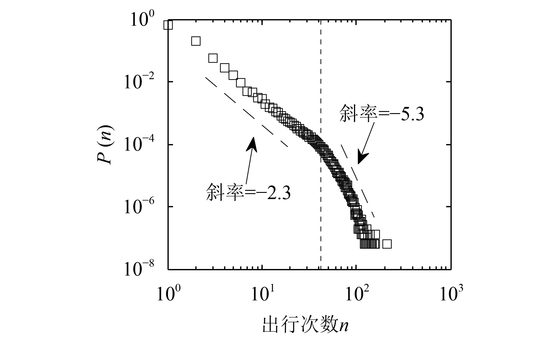 原始的偏好返回在计算探索概率时考虑个体行程分布服从幂律分布的特性,而民航旅客的出行距离分布并不具有该特性。鉴于旅客的出行次数服从双段幂律分布,旅客探索新机场的概率计算如下: