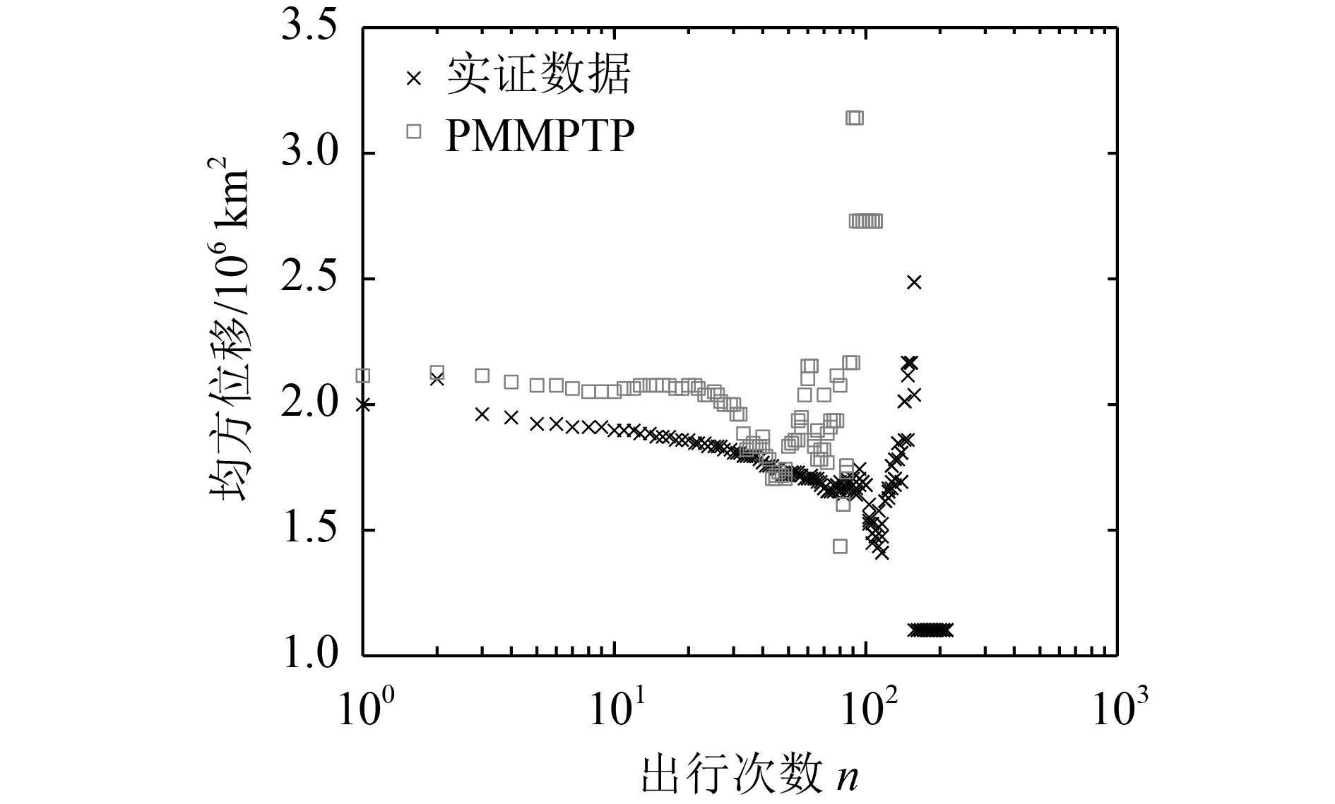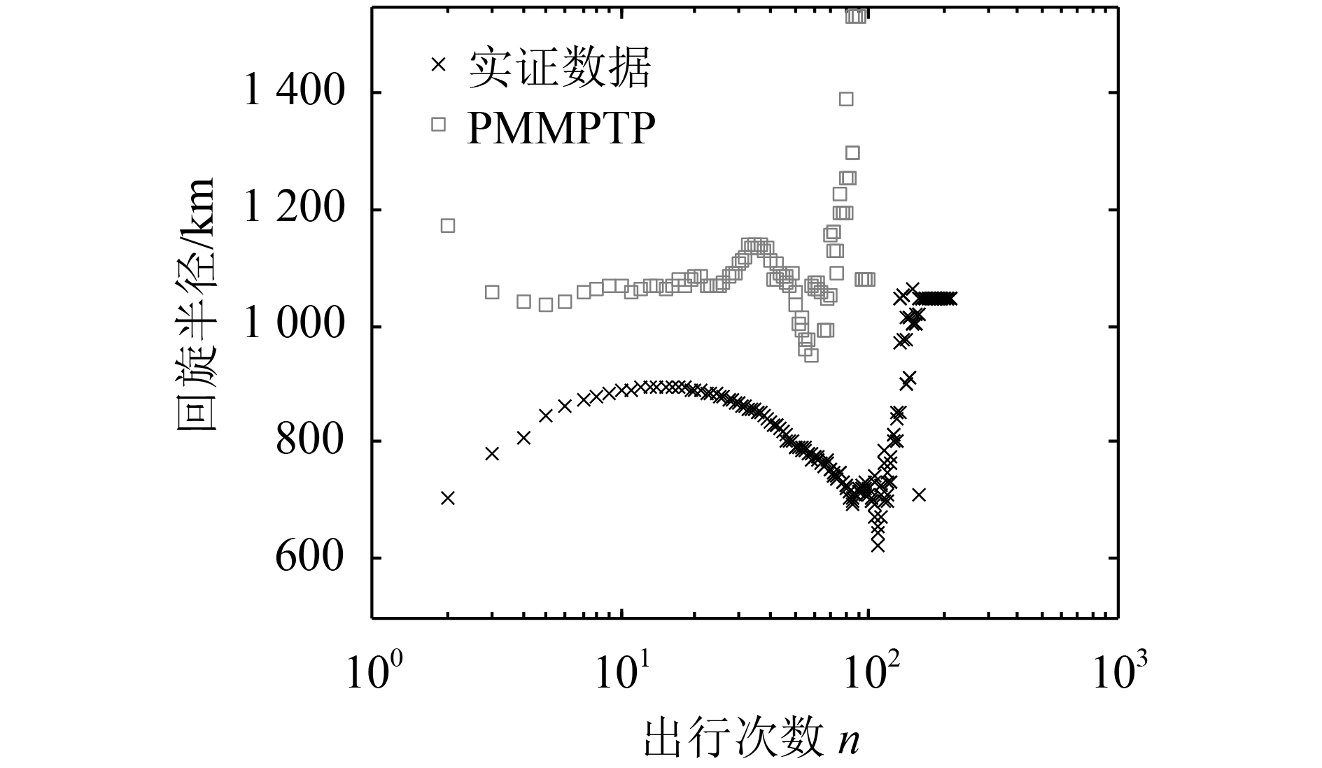 图10和11分别为PMMPTP模型对旅客回旋半径和均方位移出行次数的变化趋势的模拟结果。从图10和11中可以看出,尽管民航旅客的回旋半径和均方位移分布随旅客出行次数的不同具有复杂的变化模式,但是PMMPTP模型的模拟结果仍然和实证结果分布表现出了基本一致的变化趋势。