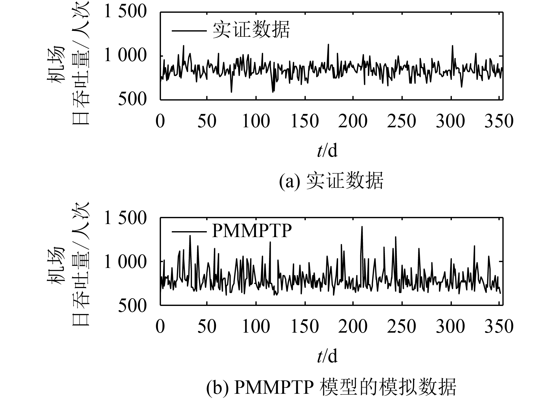 从图13中可以看出:PMMPTP模型生成的旅客出行数据的机场日吞吐量序列呈现出周期性和波动性现象;该模型生成的数据与实证数据变化趋势差别较大,这表明除了受旅客出行影响外,机场日吞吐量变化还会受到其他因素影响。