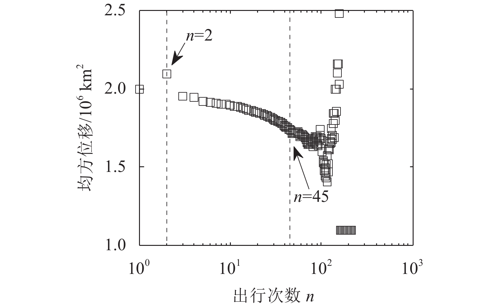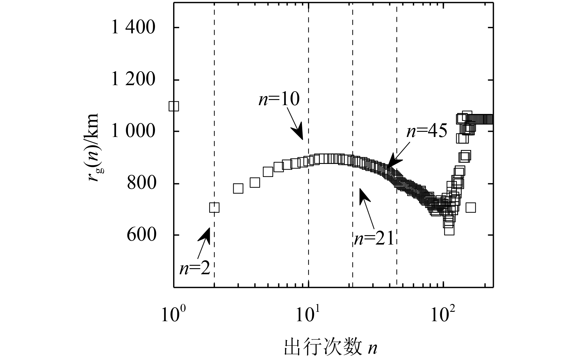 图2和3分别为旅客回旋半径和均方位移随出行次数的变化趋势。从图2、3中可以看出,随着出行次数的不同,旅客的回旋半径和均方位移均出现了不同的变化趋势,说明出行次数对旅客扩散具有很大影响。