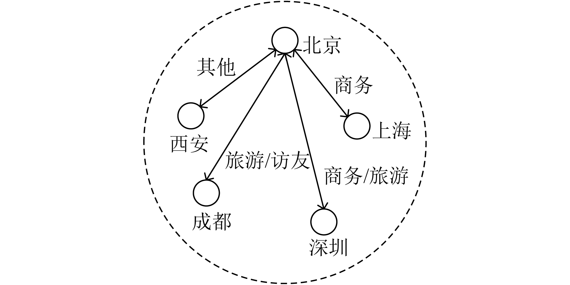 3.1 旅客潜在出行意图出行旅客在选择具体出行航线时具有一种或多种出行意图。本文将民航旅客在出行中持有的出行目的或动机定义为旅客的潜在出行意图。比如,选择到达商务型城市如北京、上海等航线的旅客,出行意图为商务出差的概率很大;而选择到达旅游型城市如九寨沟等航线的旅客可以很大程度上确定其出行意图为休闲旅游。类似地,也存在一次乘机出行中具有多种出行意图的情况。图4为在乘机出行记录中具有多种潜在出行意图的民航旅客的出行轨迹。大量民航旅客群体的潜在出行意图在民航网络中表现为各航线的吞吐量分布,因此,对影响航线吞吐量的因素分析可以转化为对于大量民航旅客群体的潜在出行意图分布的具体描述。