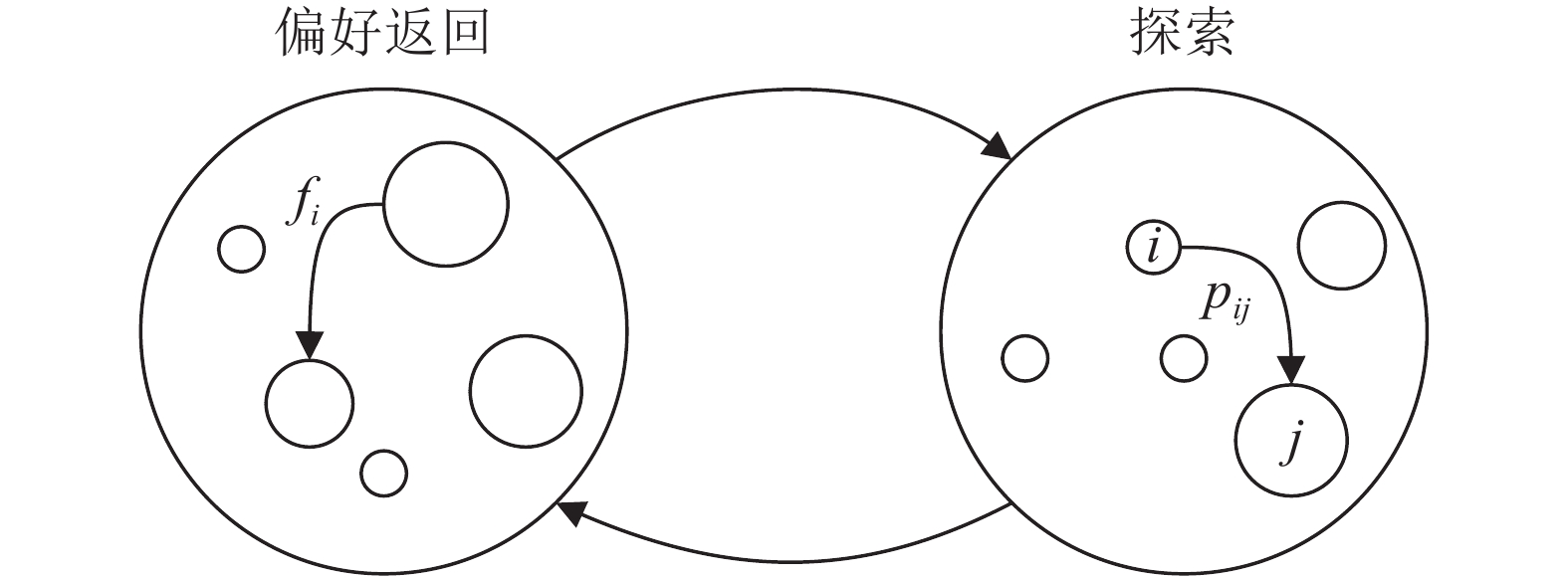 在建立模型时,认为旅客的出行次数为双段幂律分布的一个样本点(出行次数分布见式(1)),但是,仅以此特性无法解释旅客的其他出行模式。由第2节旅客出行特性分析可知,民航旅客的访问机场行为同样具有偏好返回特性。基于潜在出行意图的航线选择,主要考虑大量低频旅客出行因素的叠加,无法重现旅客整体的出行特性,因此本文在模型中引入了探索和返回机制,提出结合偏好返回特性的移动模型PMMPTP。图5为提出的PMMPTP模型的示意图。