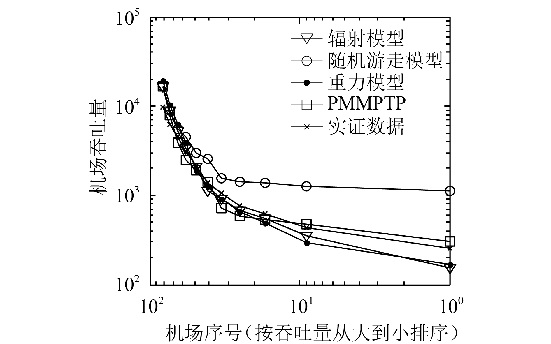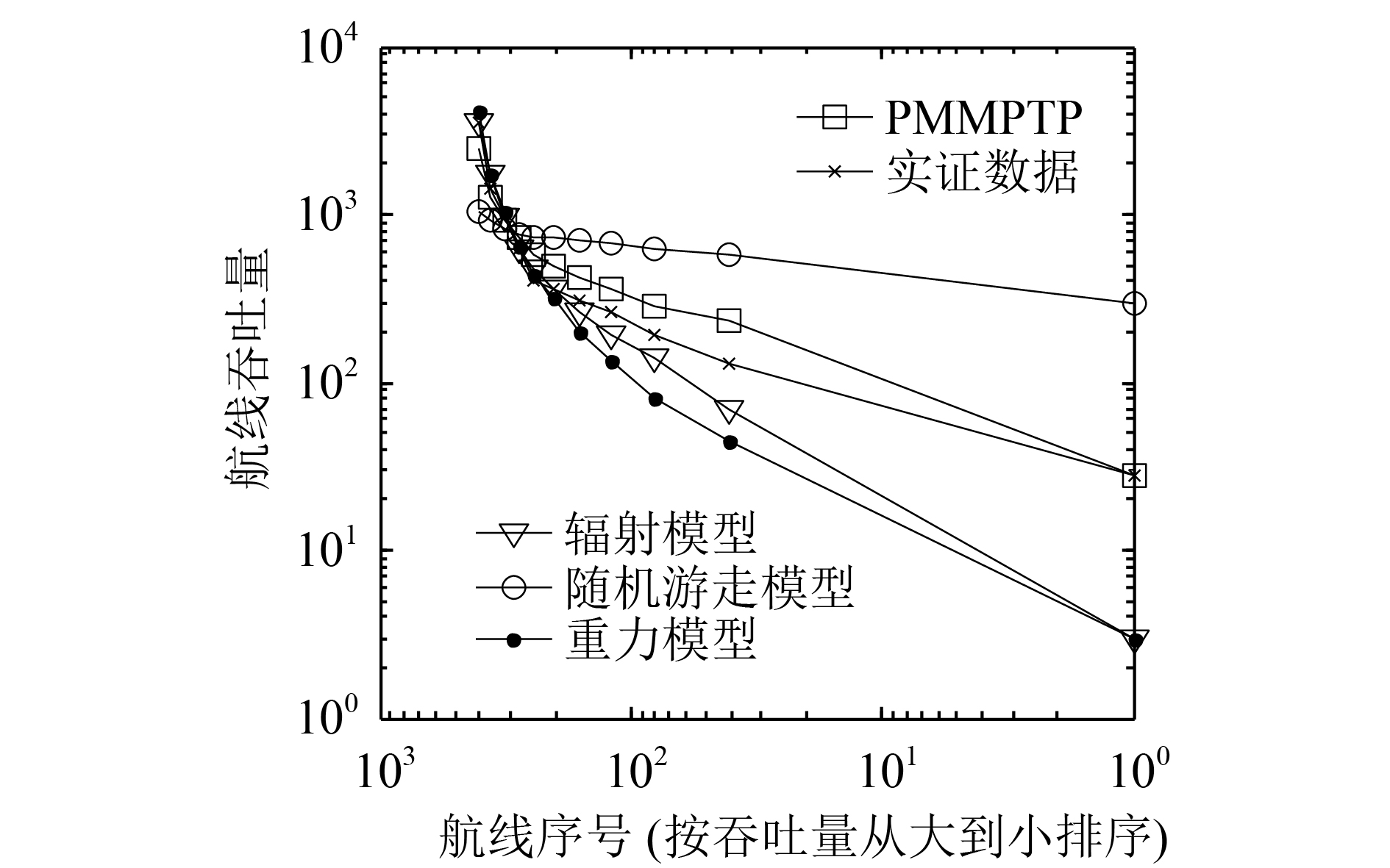 4 仿真对比与分析对PMMPTP模型进行了吞吐量、旅客出行特性两个方面的仿真测试。其中,吞吐量分为机场吞吐量和航线吞吐量。对于预处理获取的数据集,本文随机抽取了15万名旅客,其中,旅客的初始出发机场设置为出行记录中的首个出发机场,PMMPTP模型中旅客出行次数由式(1)随机生成。