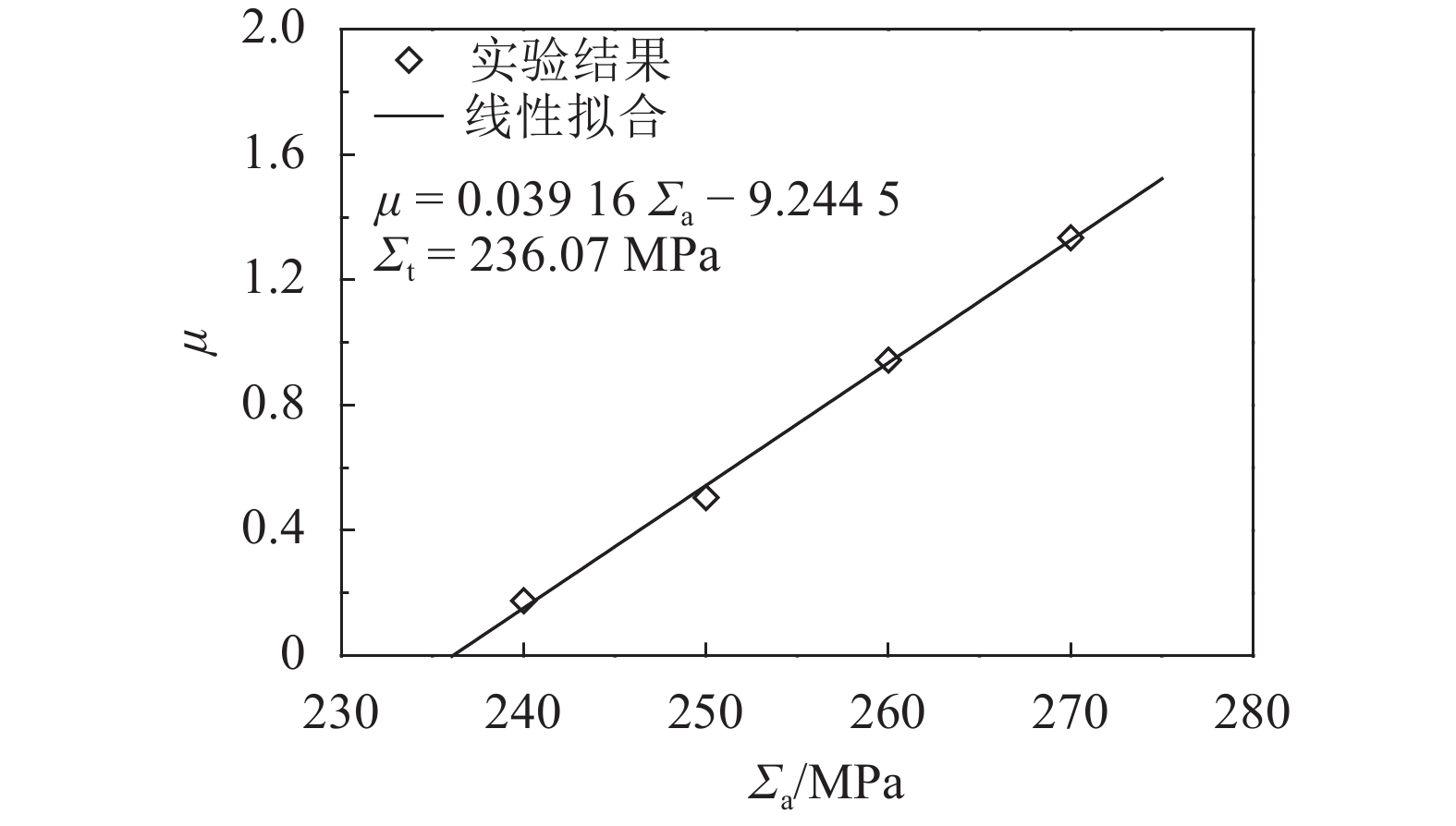 当作用于疲劳试样的循环载荷为无限寿命载荷时,疲劳试样表面的温度变化不明显[11–12]。在传统疲劳试验中,可将材料的疲劳极限看作是不会引起疲劳试样表面温度变化的最大循环作用力。因此,金属材料的疲劳极限可以利用测温设备,观测不同幅值载荷下试样表面温度变化,并将试样表面温度稳定时的温度变化量外推至临界零点来确定[13]。另外,循环载荷作用下疲劳试样表面的初始阶段温度变化率μ也可被当作独立的参数用于直接估测材料的疲劳强度[14]。图5为不同载荷条件下初始阶段试样表面温度变化率,由图5可知,将试验结果外推至相对零点可以得到Q345钢在140 Hz高频载荷作用下的有限寿命疲劳强度最低值为Σt=236.07 MPa,略低于疲劳试验所确定的疲劳寿命为107周次时的疲劳强度