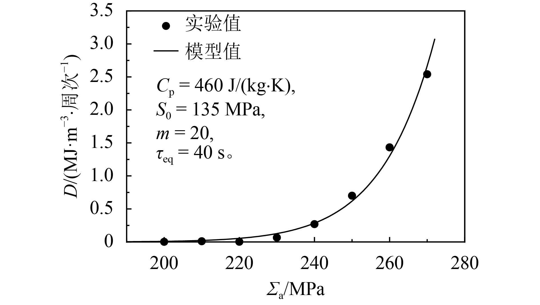 在固有耗散能试验中,每一载荷循环内材料的固有耗散能D是一个反应材料疲劳性能的本质参量,图6给出了Q345在140 Hz循环载荷作用下固有耗散能D的试验值与模型曲线。由图6可知,该模型能较好描述材料在140 Hz循环载荷作用下的固有耗散能。