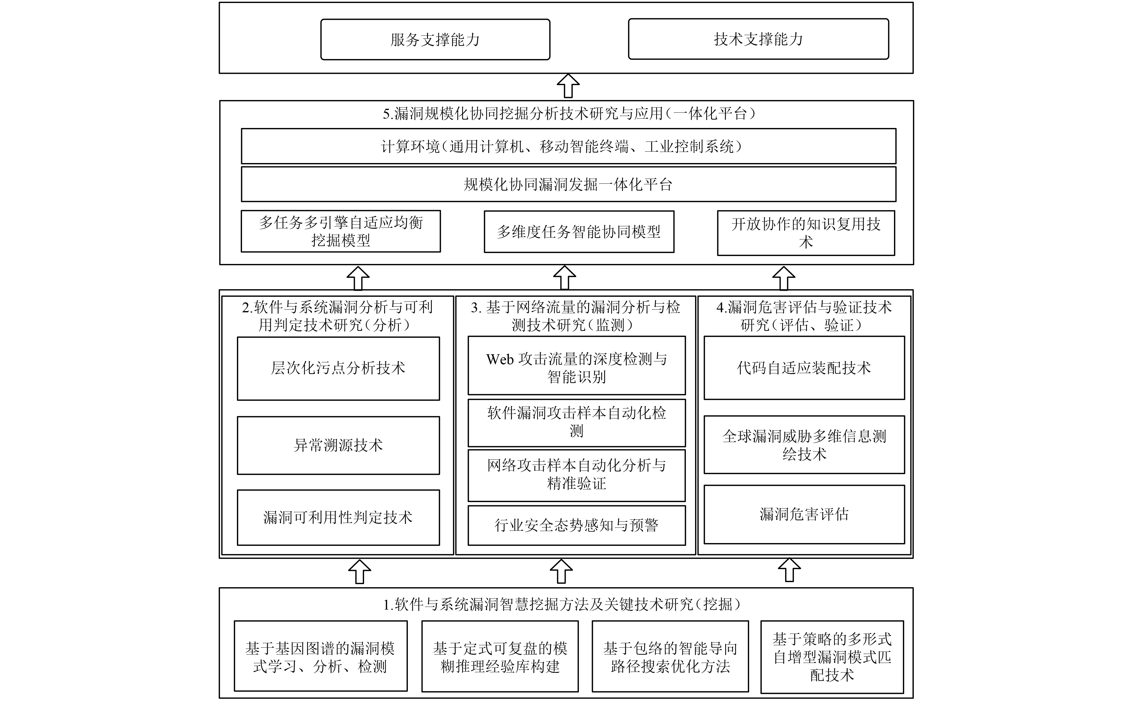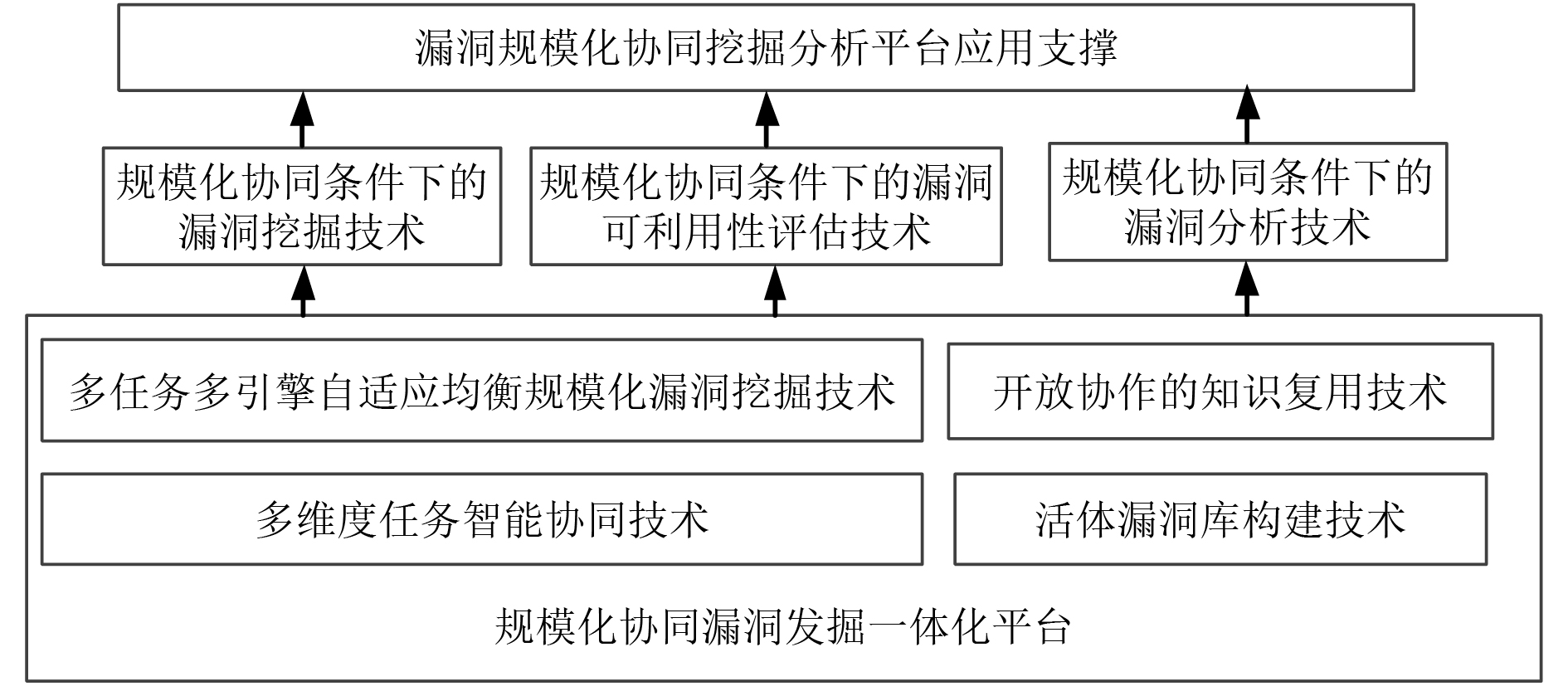 5)漏洞规模化协同挖掘分析技术研究与应用。具体内容为:研究并构建多任务多引擎自适应均衡挖掘、基因片段组合漏洞分析等模型[63];研究可动态伸缩、弹性定制的知识复用、智能连接机制;构建规模化协同漏洞发掘一体化平台,支撑典型行业的应用验证。