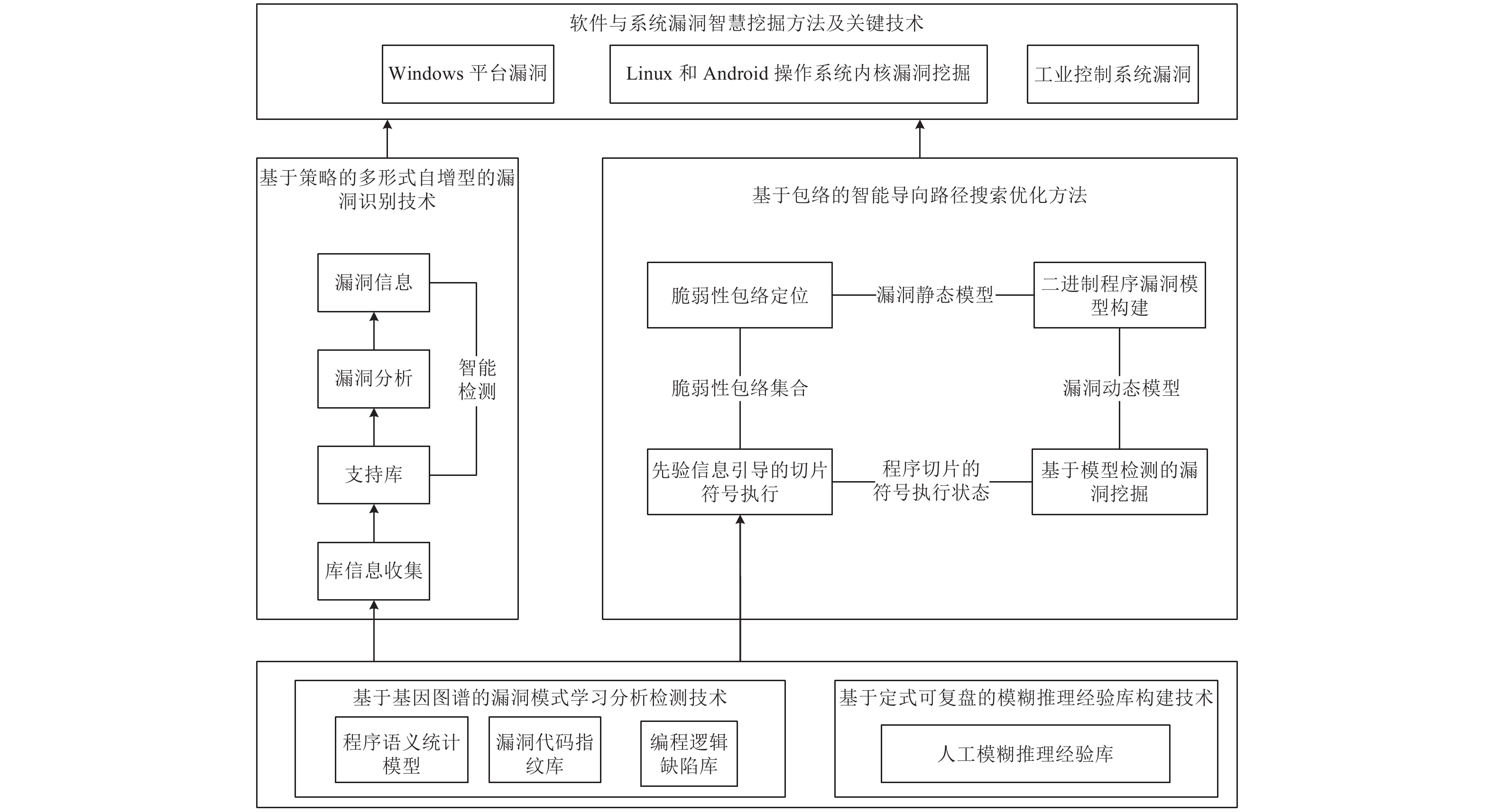 1)软件与系统漏洞智慧挖掘方法及关键技术。具体内容为:研究协同条件下大规模智慧漏洞挖掘技术与方法;研究基于基因图谱的漏洞模式学习、分析、检测技术[58–60];研究基于定式可复盘的漏洞挖掘模糊推理经验库构建;研究基于包络的智能导向路径搜索优化方法;研究基于策略的多形式自增型漏洞模式匹配技术。