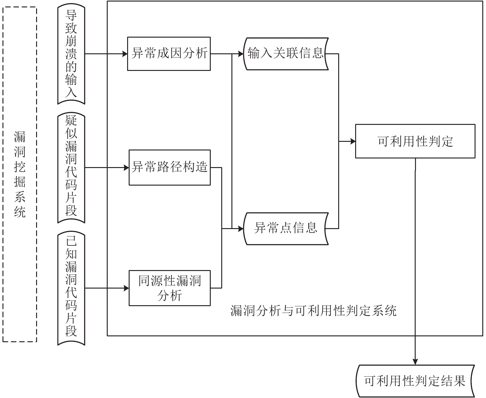 3.2 软件与系统漏洞分析与可利用性判定技术研究多种知识条件下的大规模软件漏洞的分析技术,确定漏洞位置、发现漏洞与输入的关联信息,以及构造程序异常路径,判断漏洞真实性,并依赖这些信息对漏洞的可利用性进行判定。软件与系统漏洞分析与可利用性判定技术如图4所示。