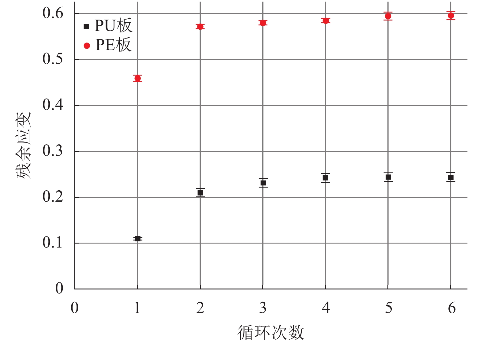 图4显示了2种材料的残余应变随循环加–卸压作用的发展趋势。可以看出,2种材料在循环加–卸压作用下均存在显著的残余应变,前2次循环完成后残余应变增大明显,从第3次循环开始发展逐渐趋于稳定,最终PE板的残余应变超过了PU板的2倍。