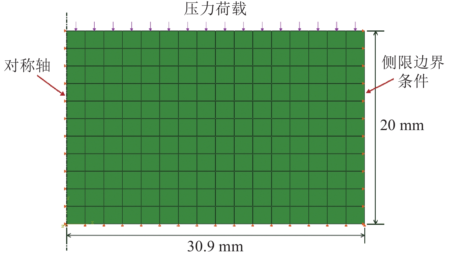 根据试验中的垫层材料试样尺寸,考虑到试样为圆柱体,如图5建立试样的平面轴对称有限元模型。基于当前有关蜗壳结构常用的非线性有限元分析平台ABAQUS,试样采用4节点双线性轴对称实体单元(CAX4)模拟,模型总共包含176个单元和204个节点。图5中模型的左、右和下部边界均施加法向约束,分别模拟模型对称轴、侧限约束和底部约束;模型上表面施加均布压力荷载。