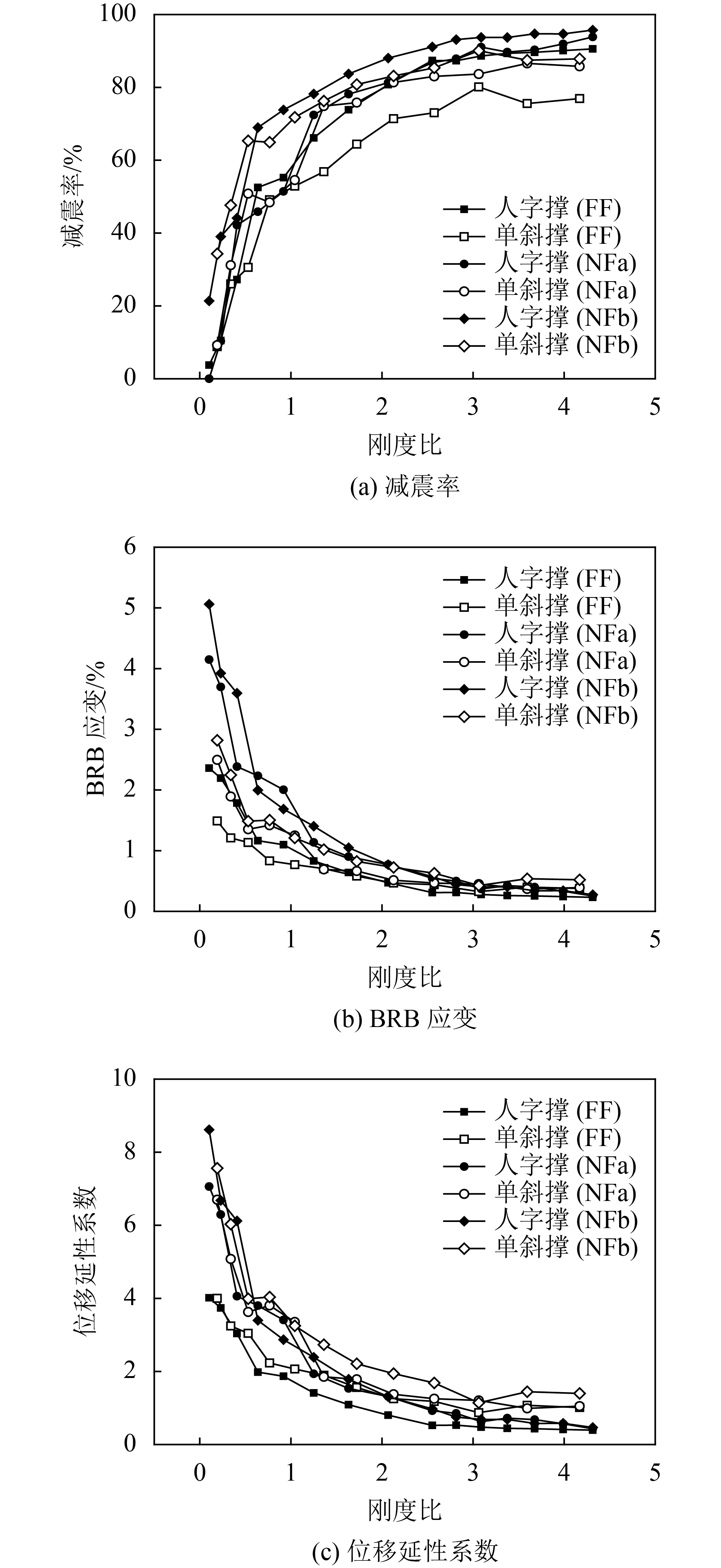 3)相同刚度比下,单斜式和人字形支撑的减震效果基本相当,但单斜撑的剪力放大效应主要集中在BRB下端连接墩上,对基础承载力要求较高。
