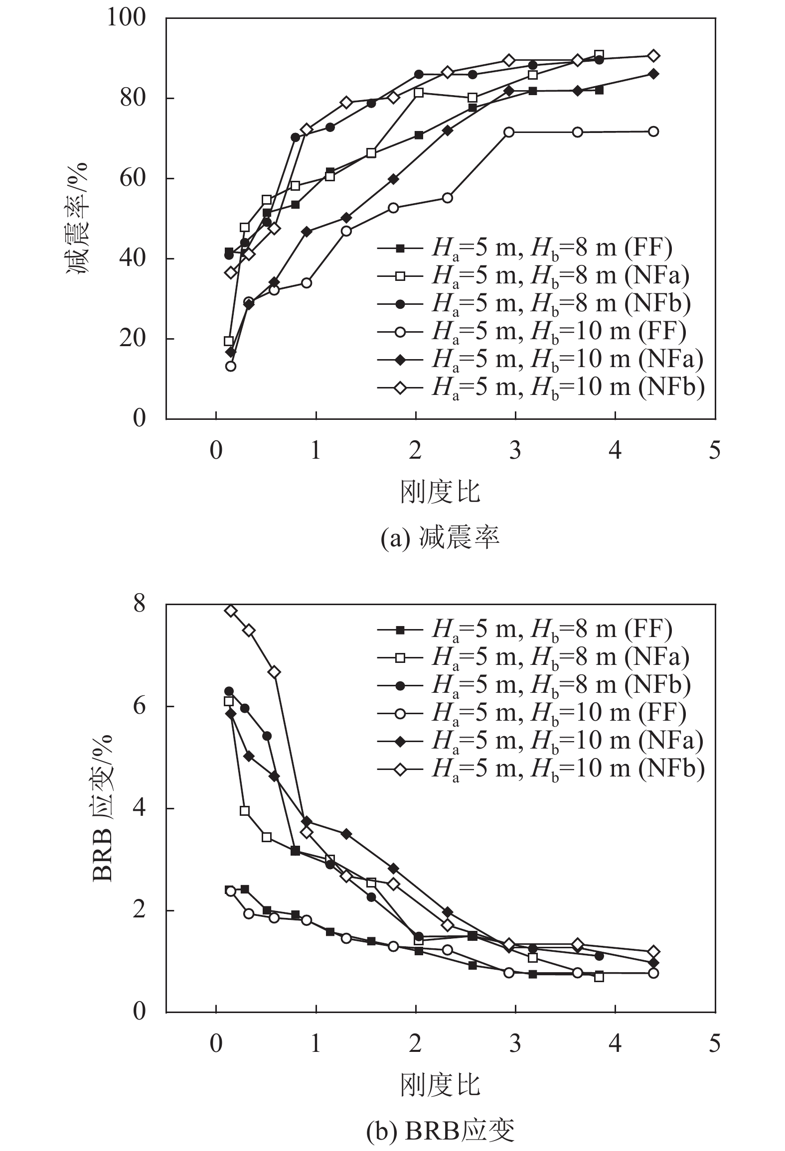 4)当排架墩的高度不同时,BRB的减震率、应变、位移延性系数也有所不同,但是与刚度比的变化规律一致且相差不大,可认为无量纲参数