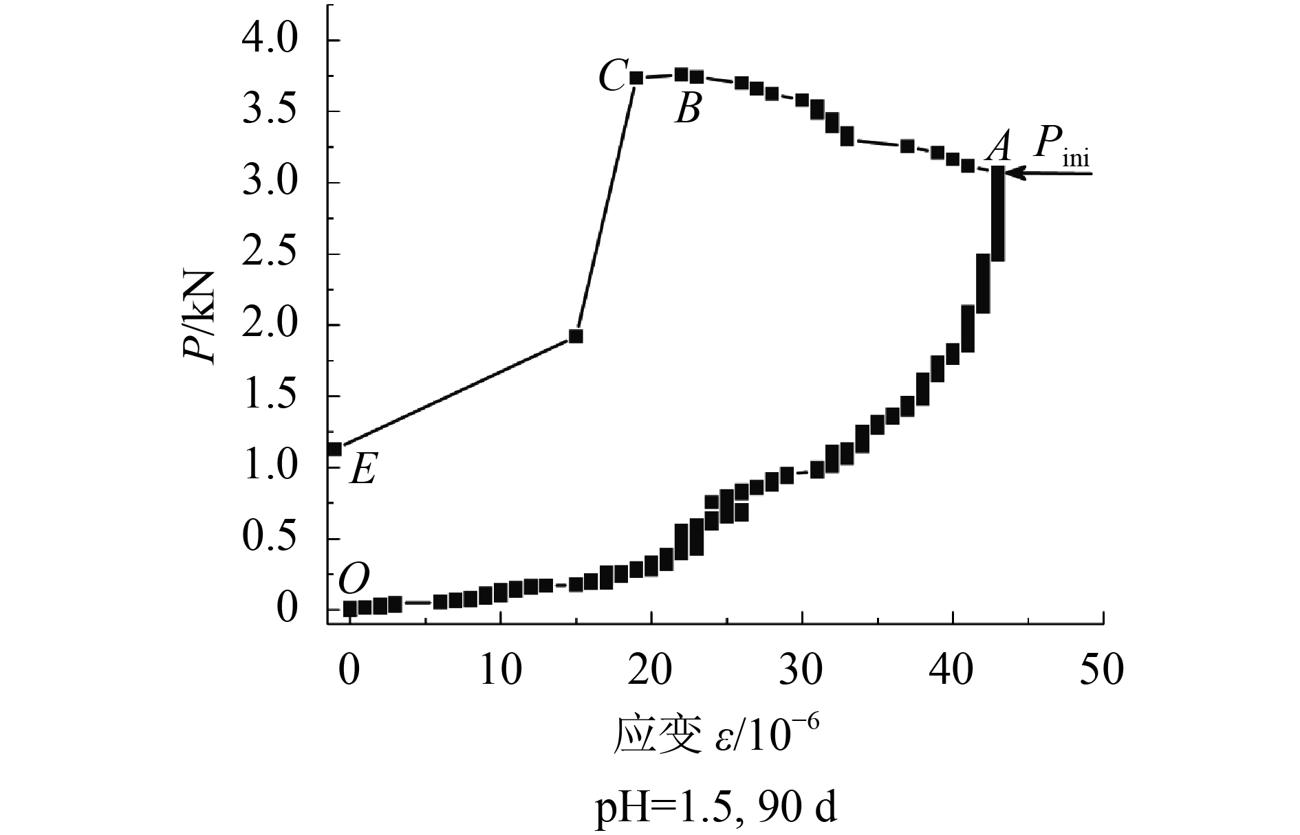 通过三点弯曲加载和电测实验得到了不同腐蚀程度混凝土试件的荷载值及相应的裂尖应变,图5给出了pH=1.5溶液中腐蚀90 d混凝土的荷载−裂尖应变曲线。