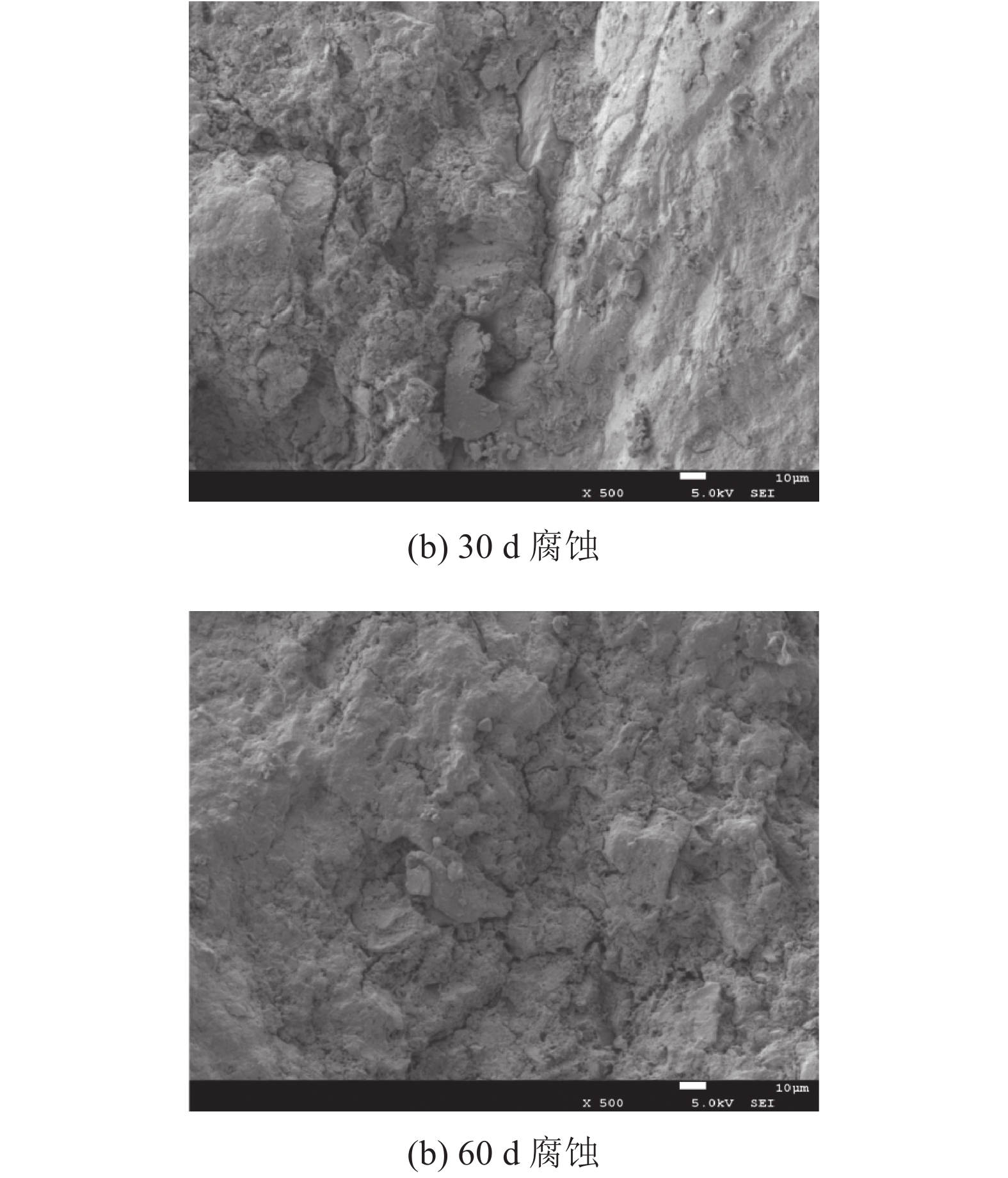 | 图7 腐蚀混凝土裂尖的微观图样 Fig. 7 Microstructures scanned near the crack tips of the fractured concrete specimens immersed in the simulated acid solution |