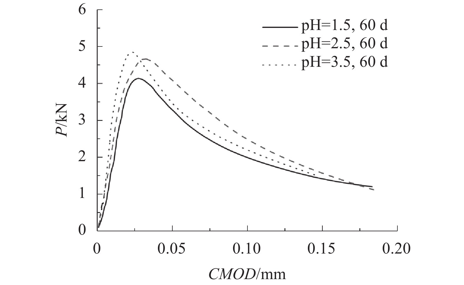 | 图9 3种pH值腐蚀下的P−CMOD曲线 Fig. 9 Testing results of the curves of load P versus crack mouth open displacement under different pH values |