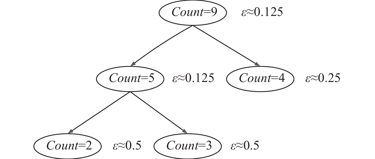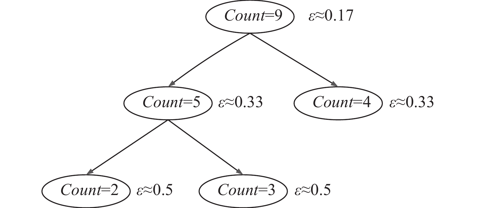 传统隐私预算分配方案以剩余隐私预算的一半逐层分配[16],随决策树高度的增加,分配到高层节点的隐私预算以指数速度减少,导致高层节点的噪声量大,分类准确率下降。传统隐私预算分配方式如图2所示。