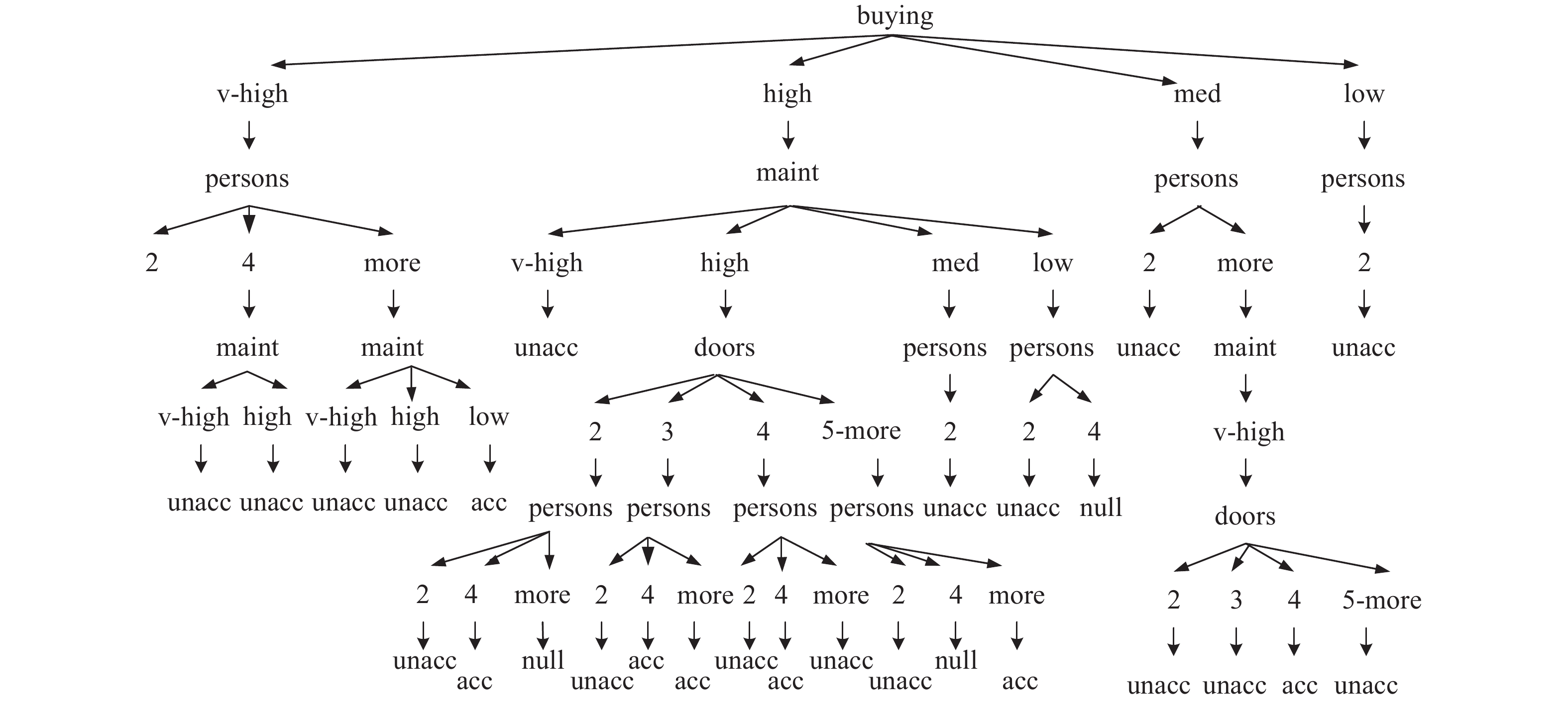 C4.5算法每一个节点下的分支都是由该属性的离散值数目决定,生成的决策树为规则较乱的多叉树。