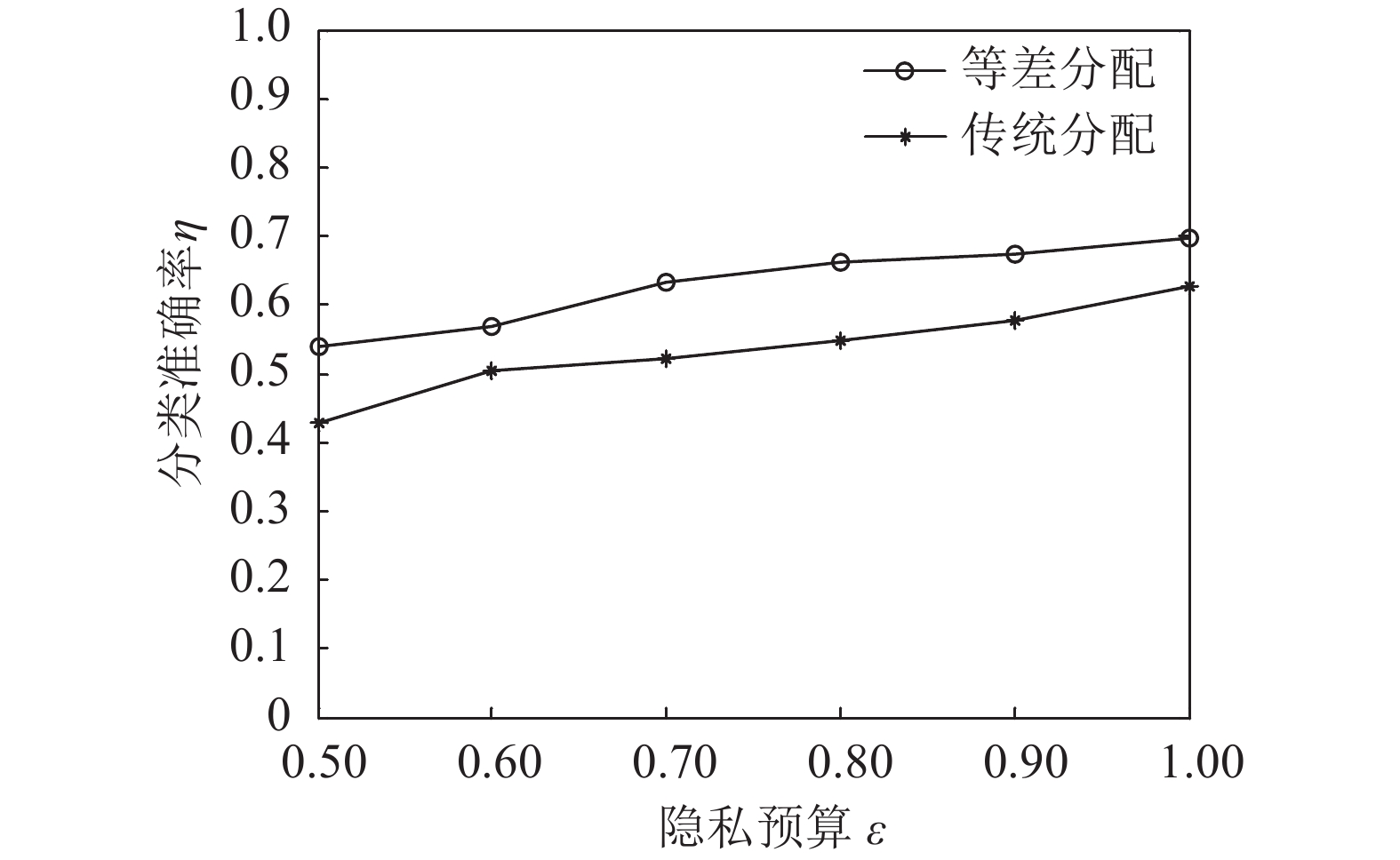 | 图6 两种隐私预算分配方案下分类准确率与隐私预算的关系 Fig. 6 Relationship between classification accuracy and privacy budget on two privacy budget allocation schemes |