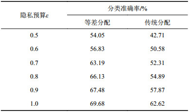 | 表2 两种隐私预算分方案的分类准确率对比 Tab. 2 Comparison of classification accuracy on two privacy budget allocation schemes |