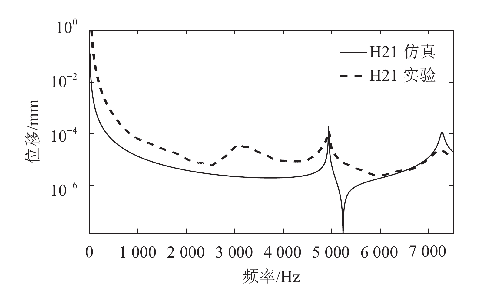 从图8和9中分别提取H11仿真和H11实验频率响应函数曲线的前2阶固有频率和幅值,采集数据如表2所示。