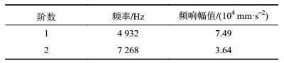 力锤锤击实验中测点1法向加速度FRF前2阶固有频率与幅值数值如表1所示。