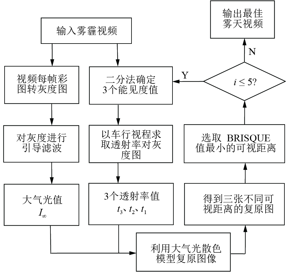 目前,利用图像增强和基于物理模型是两类主要的去雾方法。但图像增强法不考虑图像降质的本质原由,仅从增加图像对比度和凸显有用细节入手,虽然在一定程度上有去雾的效果,但丢失了很多细节信息,未能从根本上解决图像降质问题。基于物理模型是当前广为使用的一种去雾方法,He等[1]提出的暗原色先验理论,在物象亮度接近天空光亮度时,这种基于统计规律得出的先验去雾法将失效;对此,陈书贞等[2]引入混合通道结合全变差正则化(full variation regularization)方法对暗原色法进行改进,但其暗通道阈值T和亮度L难以确定;龙伟等[3]通过改进暗原色算法精细化透射率,减少暗原色先验透射率粗糙引起的Halo效应和边缘残雾,但是通过引导滤波在暗原色图中去求取透射率会消耗大量的时间;刘国等[4]引入了一个合适的阈值K来限定透射率的取值范围,避开了引导滤波求取透射率的时间复杂度,对单幅图像达到了自适应去雾;李炎炎等[5]针对恶劣交通环境下行车安全,提出了基于车行视程的视频快速去雾处理,此方法在能见度选取正确情况下可获得较好的去雾效果,但车行环境的时变性使得这种方法的实用性受到限制。为此作者通过二分法求根协同BRISQUE评价指标自动估值当前车行环境的能见度值,利用能见度与车行可视距离的关系函数求取透射率,对车载视频进行自适应的去雾处理。
