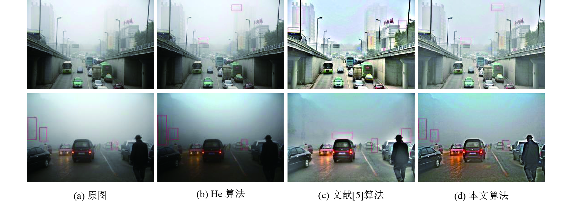 图3的视频去雾处理截图中,He算法去雾后的图像整体偏暗且细节信息损失较为严重,由于暗原色算法复杂度高,处理每帧图像上的耗时远远超过了24帧法规定的时间,所以这种方法不适于用来处理视频图像。对于文献[5]提出的算法,虽在每帧图像处理的耗时上达到了视频处理的要求,但是在红色方框标注的地方比本文算法处理的图像有更多的光晕出现,在第2排图中还有去雾不完全、细节信息丢失等情况出现。表3中信息熵描述了图像的平均信息,值越大表示包含的信息量越多。平均梯度反映了图像对细节的表达能力,值越大说明图像越清晰。实验表明,本文算法处理的图像在各项评价指标上均有很好表现,且在处理速度上也很快。为进一步说明本文去雾的算法和自动获取的最佳图像算法可行并且处理效果显著,对一段雾天下的交通监控视频进行连续去雾处理,随机取出处理后的帧图像与原始视频图像作对比,结果如图4所示。