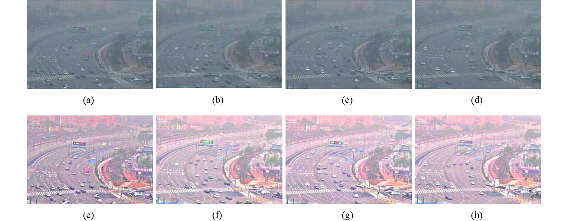 | 图4 雾天交通监控视频序列去雾效果截图 Fig. 4 Sketch of defogging effect of video sequence of traffic monitoring in foggy weather |