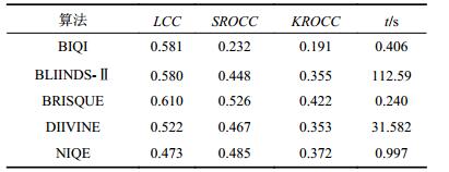 3.1 无参考图像空域质量评价(BRISQUE)改进的二分法主要通过判断能见度在20~2 000 m范围内,不同能见度值下的图像清晰化效果,筛选出去雾效果最佳的图像。但在无参考图像情况下,准确客观地评价图像质量好坏是一个科学难题。对近几年在非特定失真的无参考图像评价体系中广为使用的5种方法做了性能对比[10]: