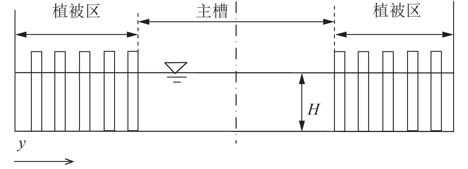 2 部分挺水植被水流如图2所示,研究对象为河道两侧沿岸生长有对称挺水植被的明渠均匀流,为了简化后续分析,图3只绘制了对称河道一半的水流结构。从图3可以看出,植被区速度较小,与主槽区的流速差异较大,导致中间的过渡区域形成剪切涡(Kelvin-Helmholtz漩涡)。