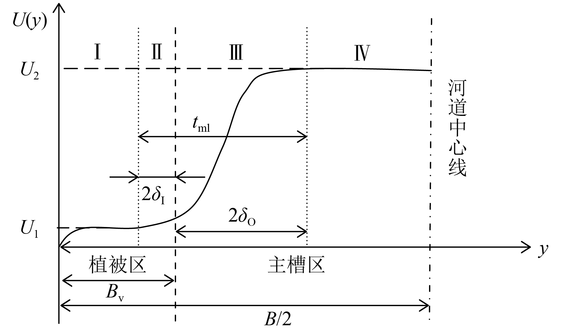 根据部分挺水植被水流的以上特性,可以将横断面分为植被稳定区(Ⅰ区)、剪切涡里层(Ⅱ区)、剪切涡外层(Ⅲ区)和主槽稳定区(Ⅳ区),在植被稳定区,流速较小且近似均匀分布,平均流速为