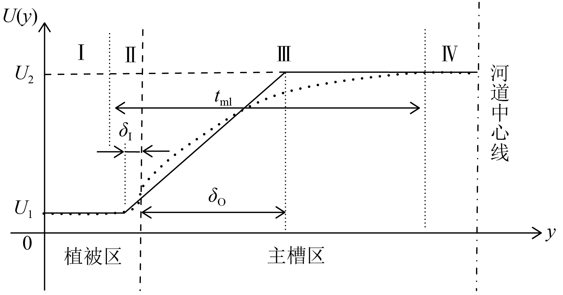 考虑到运用至实际情况,需对White和Nepf[12]提出复杂的速度经验公式进行简化,假设U1和U2保持不变,速度只在剪切涡核心区域(0.5tml)线性过渡,简化后的速度线性分布结构如图5所示,相较于建立一个有许多任意参数的非常详细的模型,简化后的速度公式满足精度要求,且该方法在数学上易于处理,能够为实际应用提供良好的估计。