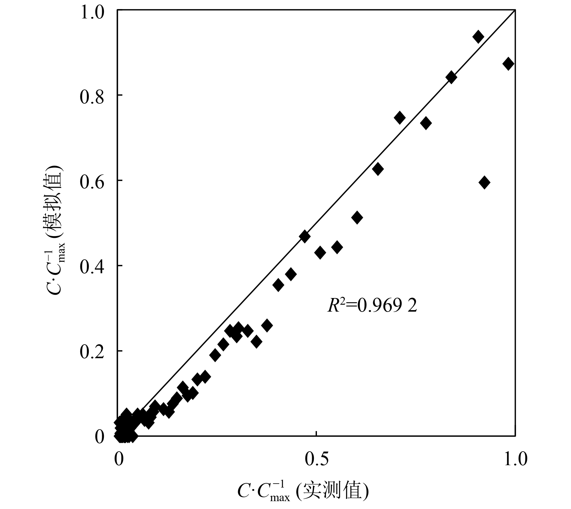 | 图9 实测浓度相对值与模拟浓度相对值的相关度(Cmax为x=4 m处的浓度最大值) Fig. 9 Correlation between measured relative concentration and simulated relative concentration (Cmax is the maximum concentration at x=4 m) |