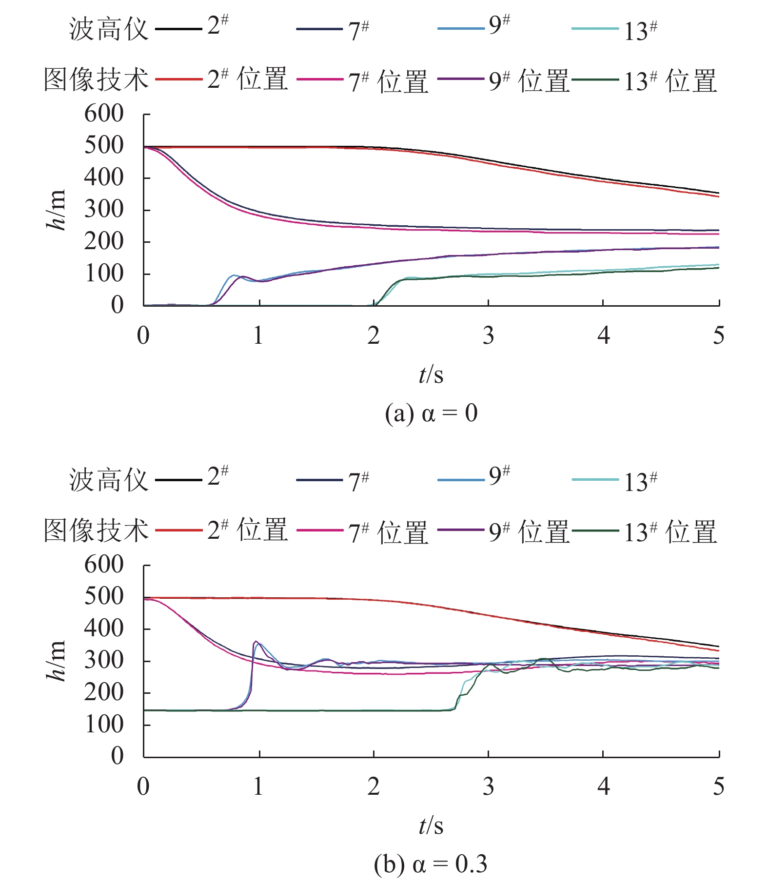 3.2 水深随时间变化α=0及α=0.3这2个工况,在上下游各取2处,比较图像处理技术与波高仪获得的水深随时间变化关系,如图10所示。对比表明,上游2#波高仪在溃坝开始2 s内,水深数据和图像技术得到的水深数据吻合很好,2 s后波高仪数据略高,这是由于上游在溃坝开始时处于静水区,随时间增加,水流成为渐变流区,水流受干扰变大。7#波高仪靠近坝址,水流变化剧烈,波高仪数据都普遍高于图像技术。通过两种技术获取的9#、13#两处水深变化规律类似,在水流未演进到其位置时,二者数据符合很好;水流经过后,α=0工况波高仪数据同图像技术符合良好,α=0.3工况波高仪数据略高于图像技术,在经历第一个波峰后,波高仪数据明显高于图像技术。