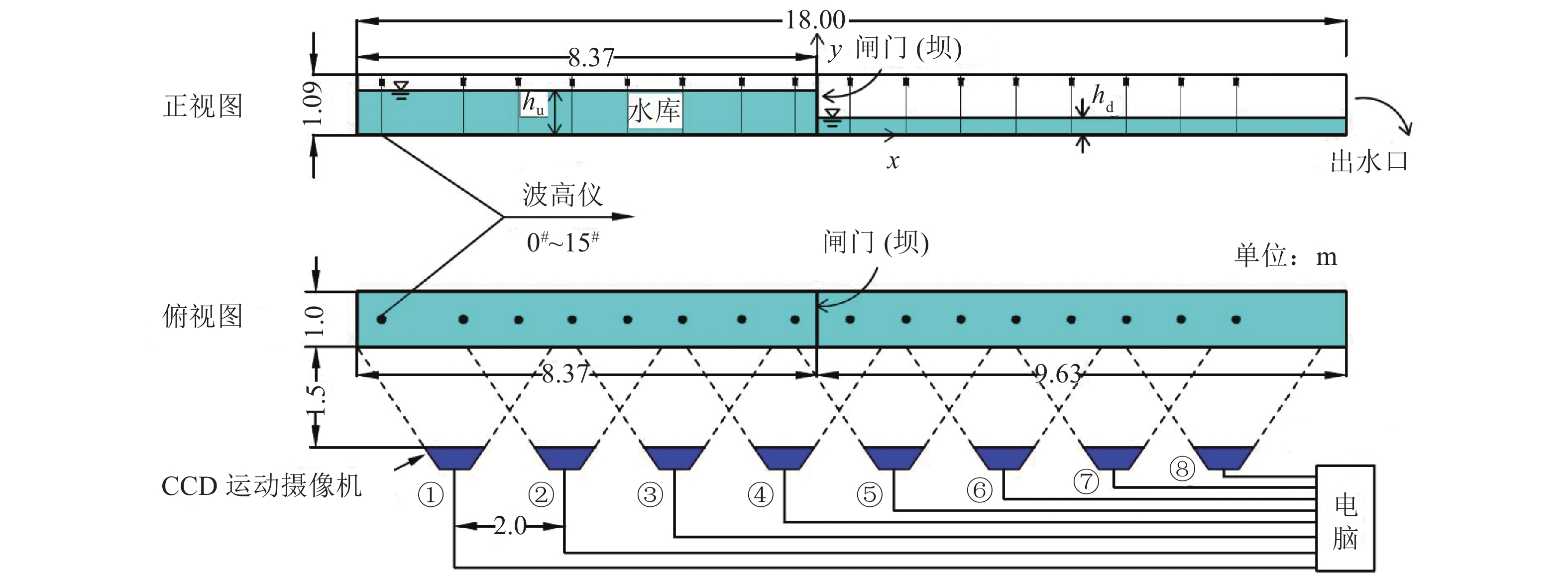 2 矩形水槽中的应用采用有机玻璃制作矩形水槽物理模型,模型长18 m,宽1 m,高1.09 m,坡度为0.3%,闸门垂直安装在距离上游8.37 m处,闸门将水槽分为上下游两部分,上游相当于水库,闸门相当于大坝,闸门使用15 mm厚度的硬质木板,下游出口采用硬质纤维板挡水,出口配置由螺杆控制高度的开关,可调节下游水位,以适应不同工况。在距离水槽右岸边壁1.50 m的位置,每隔2 m安装1台CCD运动摄像机,共8台。水槽模型实物照片及其正视图、俯视图如图3、4所示。在水槽正下方修建了蓄水池,试验用水采用甲基紫溶液染色,以便于区分水和空气的界面,试验时通过水泵从蓄水池抽取染色的水,再通过下游出口退回到蓄水池,由此可循环利用。闸门上方架有YEJ2–90L–4型电磁制动异步电动机,中间由钢绳连接,为满足试验条件下瞬间溃坝的要求,闸门的提升速度须很快且对水流状态的干扰较小,闸门从水槽底上升到顶部用时t需满足式(1)要求[16]。