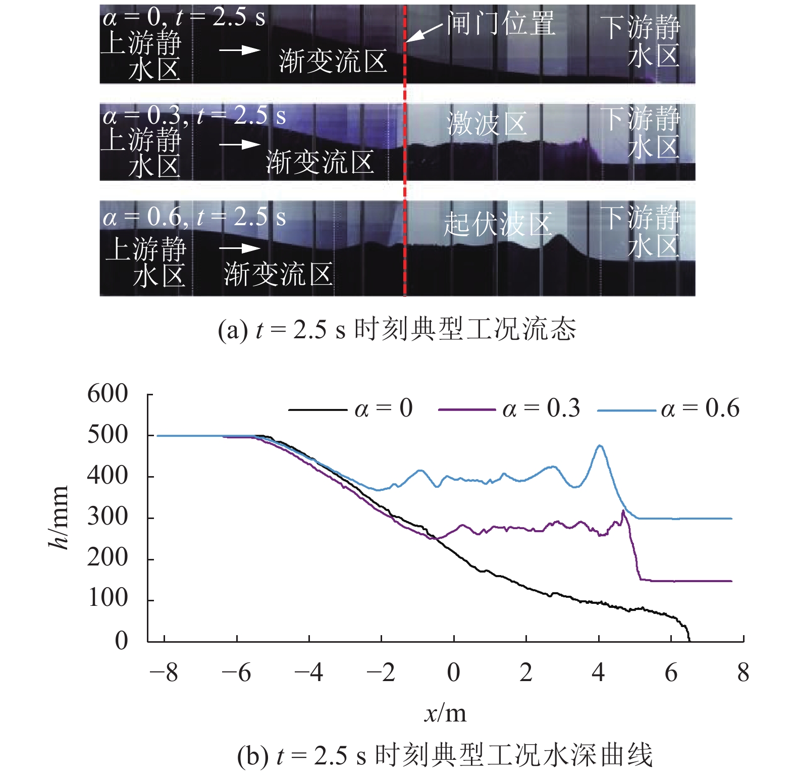 | 图5 3种典型工况t=2.5 s时刻流态图及水深曲线 Fig. 5 Flow regimes and water depth profiles in three typical conditions at t=2.5 s |