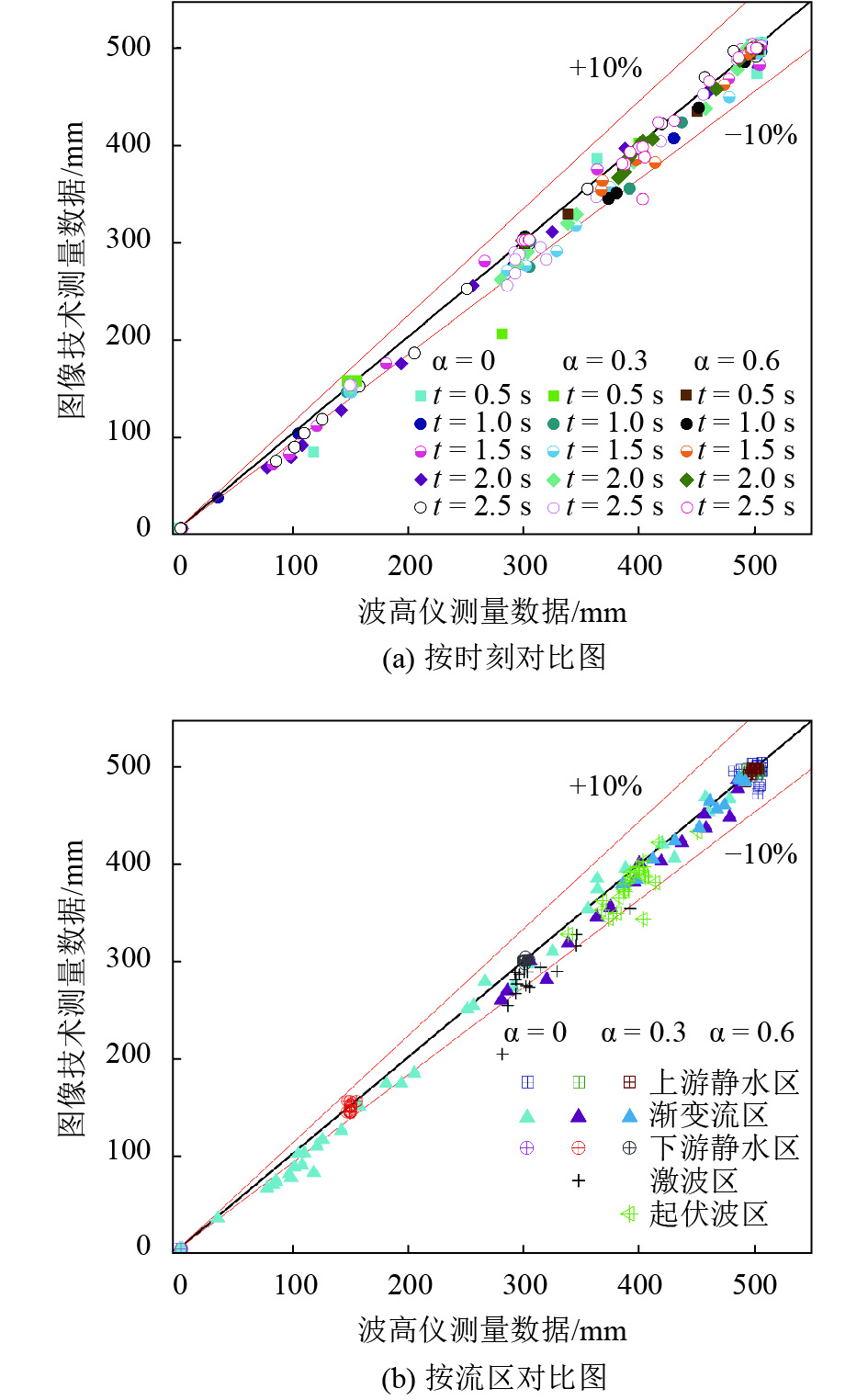 3种工况下2种测量方法所得结果的对比情况如图7所示,图7(a)、(b)中数据点分别按时刻、流区分类。总体而言,数据点普遍位于对角线下方,说明波高仪测量的数据普遍高于图像技术。下游无水(α=0)时,上下游静水区2种技术数据点吻合较好,误差限定在±10 %以内;渐变流区在t=1.0 s内数据点吻合较好,超过1.0 s后,误差超过–10 %。水深比α=0.3时,上下游静水区规律同下游无水(α=0),误差在±10 %以内;渐变流区误差较下游无水(α=0)时小,中部激波区数据点误差较大,波高仪测量数据明显大于图像技术。水深比α=0.6时,静水区和渐变流区误差均在±10 %以内,但起伏波区误差较大。表明水流受干扰越大,数据点越偏右,波高仪数据较图像技术越大。