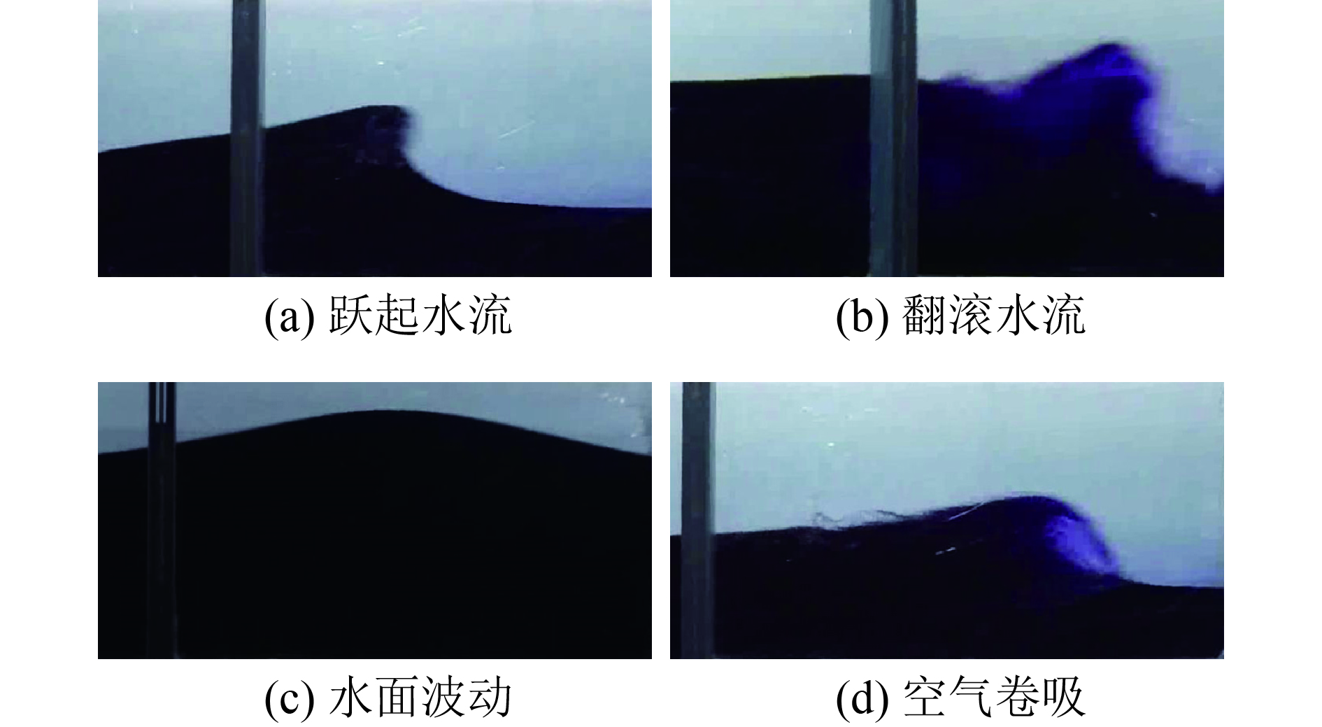 试验观察发现,视水深比不同情况,溃坝波常伴有水流跃起、水流翻滚、水面波动及空气卷吸等局部流态,如图8所示;利用图像技术可以很好的捕捉这些流态,如图9所示, 这些水流特征是波高仪难以获取的。