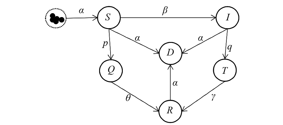 | $\left\{ \begin{aligned} & \frac{{\rm{d}}S\!(t)}{{\rm{d}}t} = \alpha - \beta S\!(t)I(t) - pS\!(t) - \alpha S\!(t), \\ & \frac{{\rm{d}}I(t)}{{\rm{d}}t} = \beta S\!(t)I(t) - qI(t) - \alpha I(t), \\ & \frac{{\rm{d}}Q(t)}{{\rm{d}}t} = pS\!(t) - \theta Q(t - \tau ), \\ & \frac{{\rm{d}}T(t)}{{\rm{d}t}} = qI(t) - \gamma T(t - \tau ), \\ & \frac{{\rm{d}}R(t)}{{\rm{d}}t} = \theta Q(t - \tau ) + \gamma T(t - \tau ) - \alpha R(t) \end{aligned}\right.$ | (1) |