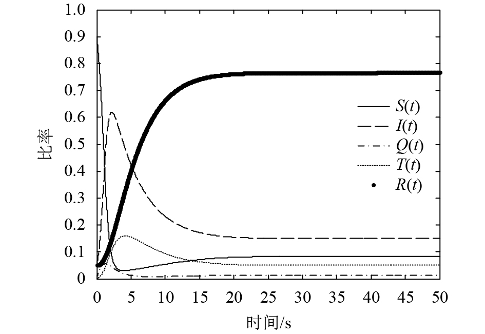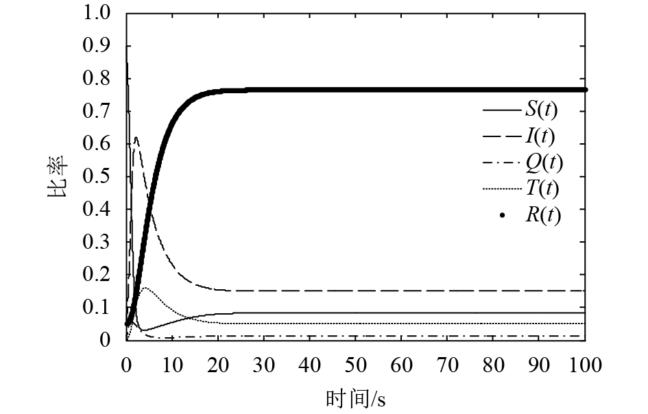 定义1(净化平衡解) 当传播系统中所有状态的节点数量都不会产生大幅度的波动,即系统处于稳定状态时,若系统中的感染节点已经全部转化为免疫节点,称该传播系统中(S,I,Q,T,R)的收敛值为系统的净化平衡解。此时系统中I=0,T=0。若系统中存在净化平衡解且满足全局稳定性,表明恶意软件在该系统中的传播受阻,最终会消亡。
