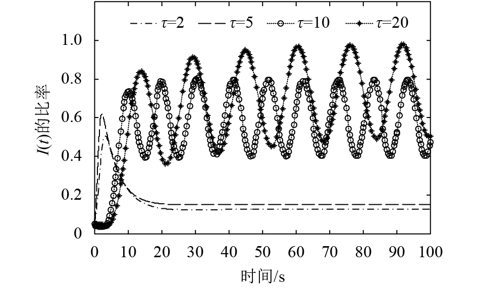 从图5还可以看到:在最初的传播阶段,曲线相互有重叠,这说明初始阶段时滞对于系统的传播影响不是很大。但是随着时滞的不断增加,曲线的变化趋势相差较大,周期和振幅都出现明显的不同步,说明时滞的大小对系统的传播产生影响,并且时滞越大,影响越明显。