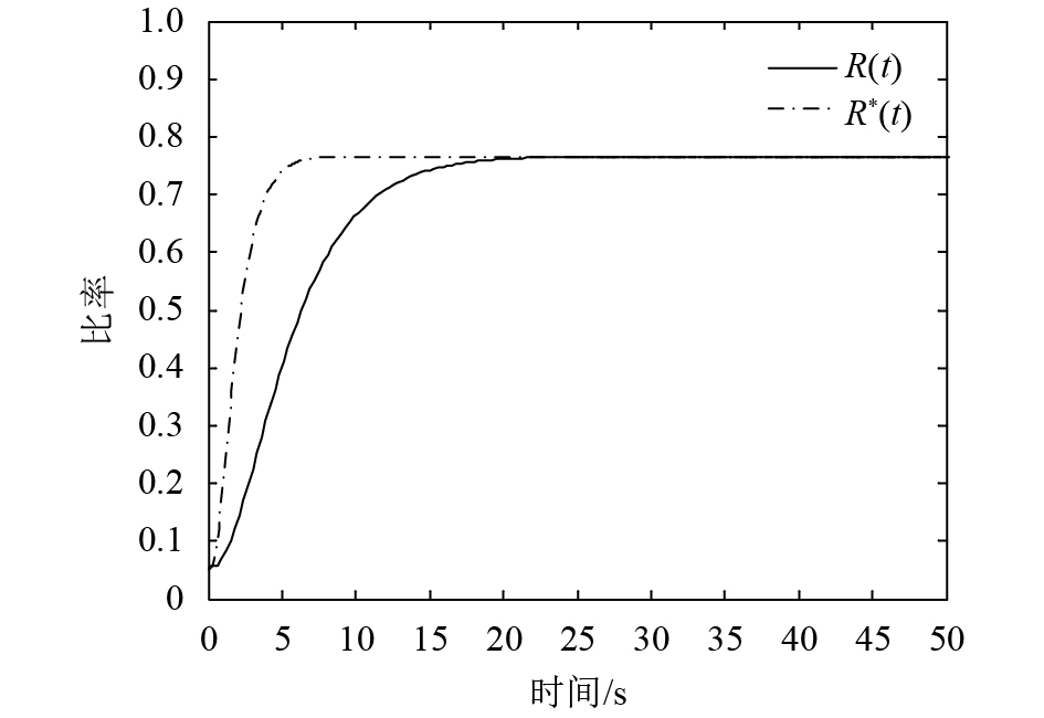 3.3 模型对比将本文模型与文献[3]中模型进行对比,Yao等[3]研究了稳定的延迟网络蠕虫传播模型,其证明完整,分析具有代表性。对比不同模型在相同参数情况下系统的传播特性。取N取值为1 500,初始状态的感染节点比率是0.05,易感节点比率为0.9,免疫节点比率为0.05。令参数值p=0.1,q=0.2,α=0.05,β=2,θ=0.6,γ=0.6,τ=2。设本文模型的免疫节点比率为R(t),文献[3]中模型的免疫节点比率为