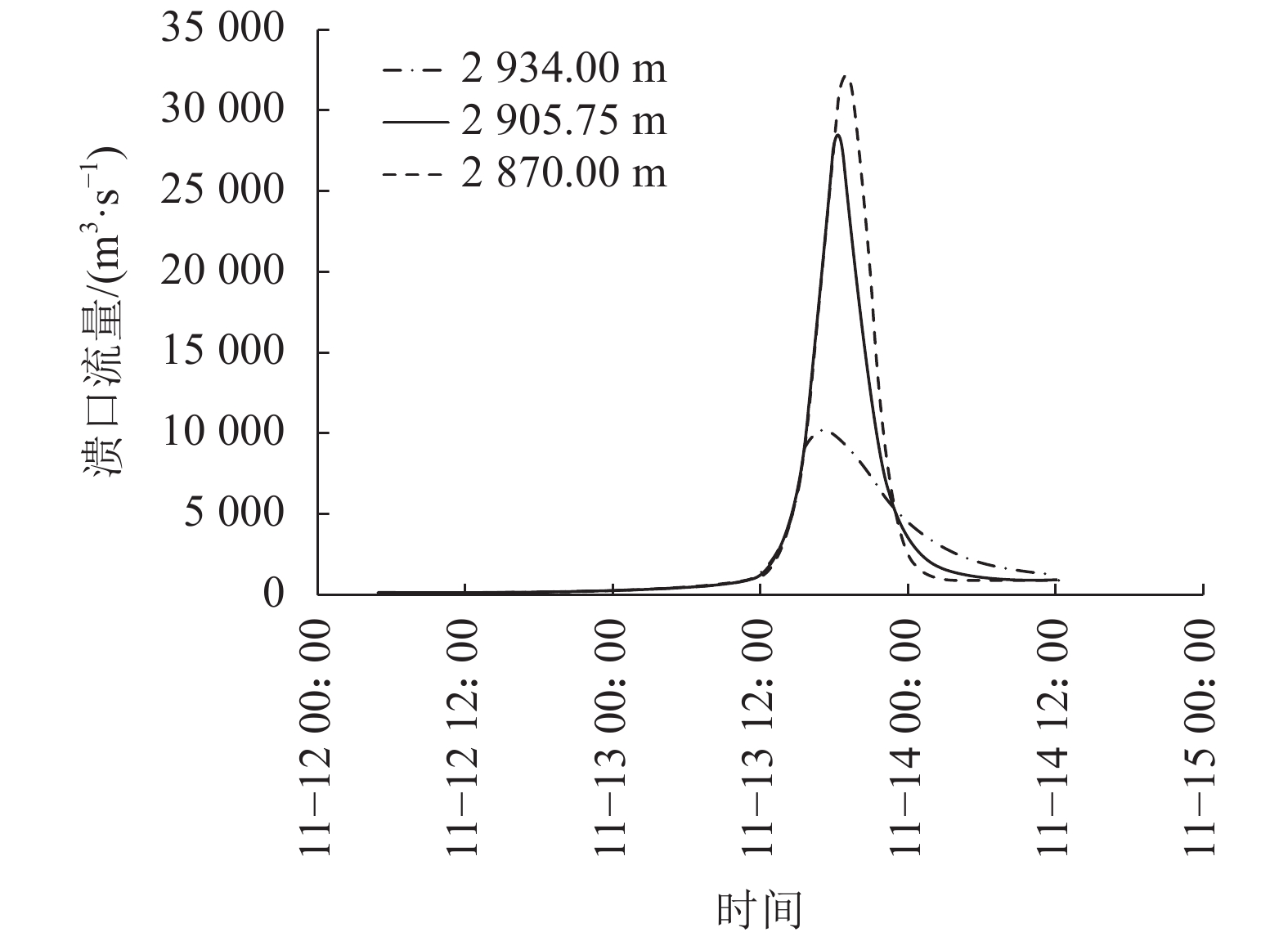 为了研究堰塞体溃决后残留坝高对溃决过程的影响,将堰塞体溃决后最终底部高程由2 905.75m变为2 934.00 m(1/3溃坝)或2 870.00 m(全溃坝),其他参数保持不变。表5给出了残留坝高敏感性的分析结果,图10同时给出了不同残留坝高情况下的溃口洪水流量过程。由表5可知,随着残留坝高的降低,溃口峰值流量和溃口最终顶宽呈上升趋势,而溃口底宽逐渐减小,峰值流量出现时间逐渐滞后。究其原因,应与堰塞湖溃决时的水动力条件相关。由图10可以看出:随着高程的降低,白格堰塞湖库面面积迅速减小,因此当溃口最终底高程由2 905.75 m降低至2 870.00 m时,溃口峰值流量仅增加12.4%,相较于溃口最终底高程由2 934.00 m降低至2 905.75 m时的溃口峰值流量明显减小。究其原因,应为随着堰塞湖水位的快速下降,水动力条件明显减弱,溃口顶宽增大趋势减缓,而由于溃口下切深度逐渐增大,底宽反而呈逐渐减小的趋势;由于溃口下切过程中水动力条件逐渐减弱,峰值流量出现的时间也逐渐滞后。