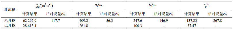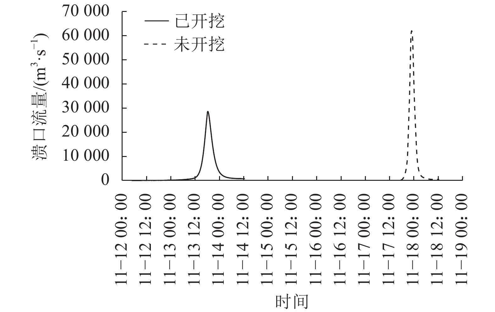 | 图11 开挖泄流槽与否情况下的溃口流量过程 Fig. 11 Breach hydrographs for excavating drainage channel or not |