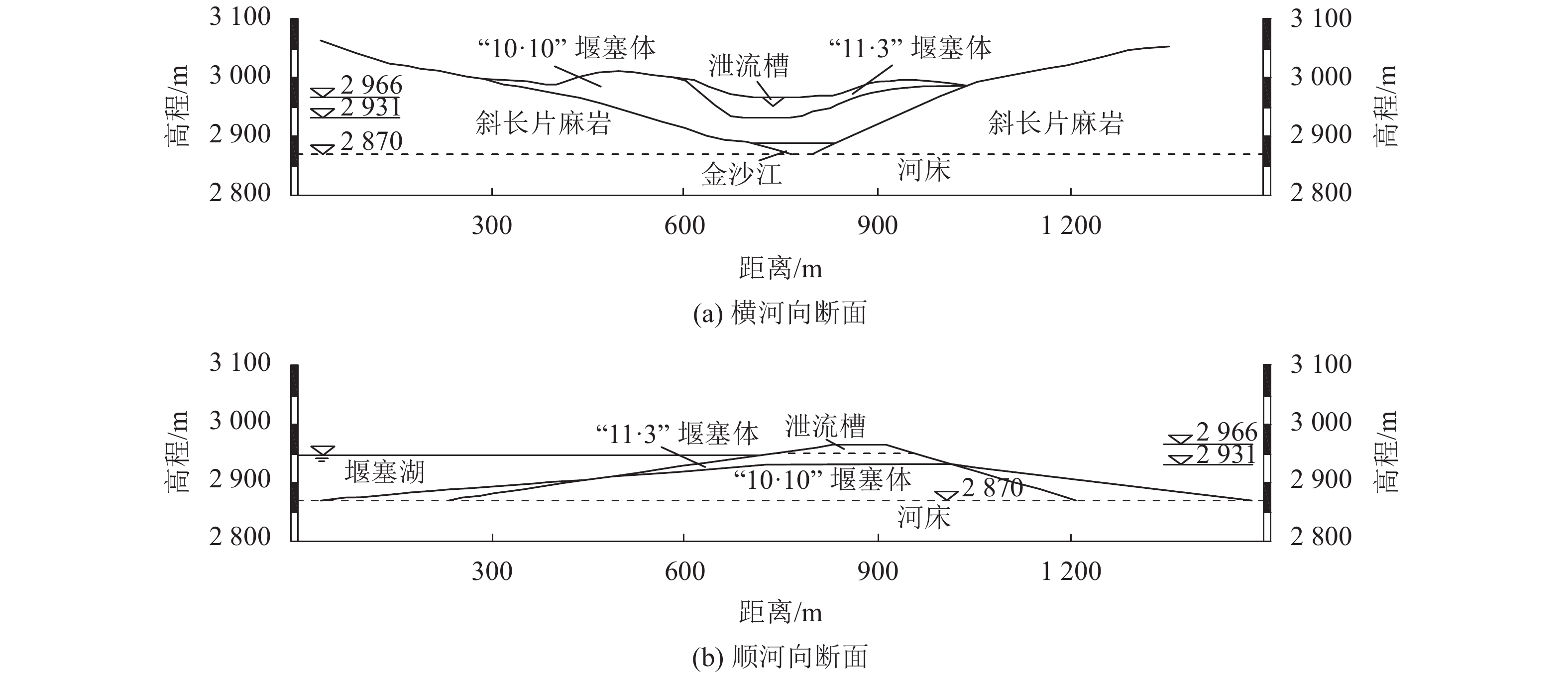 1 白格堰塞湖溃决过程概述2018年10月10日22:06,中国四川省与西藏自治区交界的白格村(北纬31°4′56.41″,东经98°42′17.98″)金沙江右岸发生滑坡[1,18-20],形成堰塞体,完全堵塞了金沙江,据实测分析,“10·10”白格堰塞体的体积约为2 750×104 m3[21]。由于水位上涨迅速,且道路不畅,无法及时采取人工干预措施,堰塞湖于10月12日自然漫顶溃决[21-22]。2018年11月3日17:21,同一地点发生了二次滑坡[23-24]。“11·3”滑坡体的体积约为160×104 m3,滑坡体在下滑过程中沿途裹挟约140×104 m3的坡面残留碎屑和风化岩石高速下滑,堵塞“10·10”堰塞湖溃决形成的新流道,造成二次堵江[21](图1)。两次白格堰塞湖的形态特征参数见表1。图2给出了两次堰塞体的断面形态示意图[25]。
