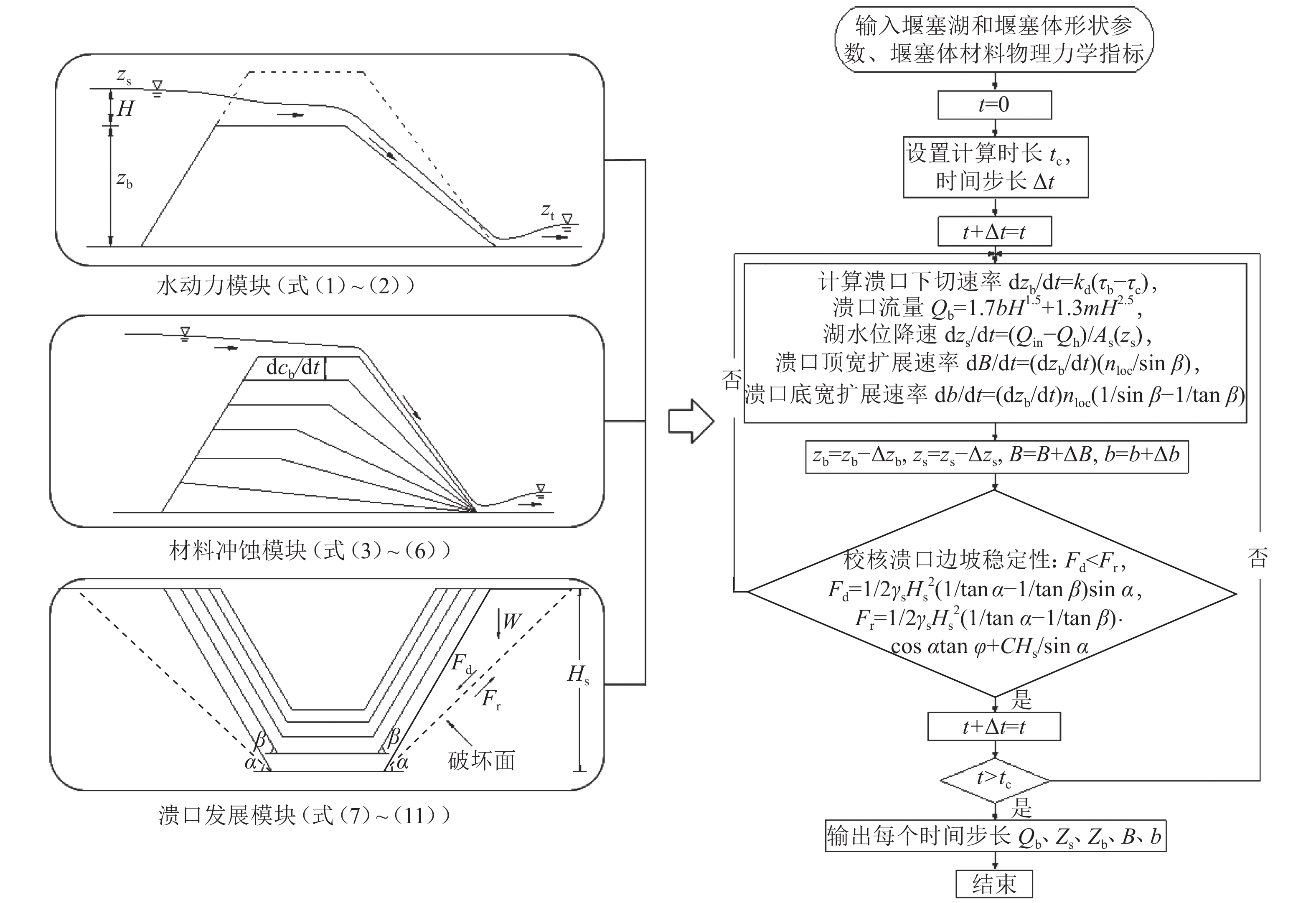 堰塞湖溃决过程数学模型主要包括3个模块:水动力模块、材料冲蚀模块和溃口发展模块。模型采用按时间步长迭代的数值计算方法模拟堰塞体溃决过程中的水土耦合作用。